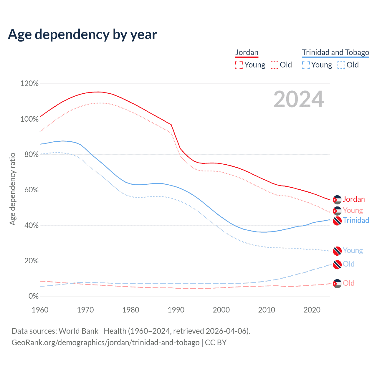 - Jordan is ranked 131/196 by median age (oldest to youngest) vs 58/196 for Trinidad and Tobago.