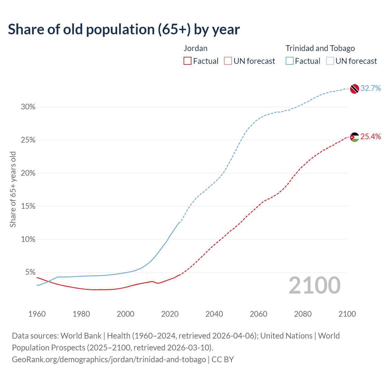 The share of older people aged 65 and over is 4.52% in Jordan and 12.4% in Trinidad and Tobago. Life expectancy in Jordan compared to Trinidad and Tobago .