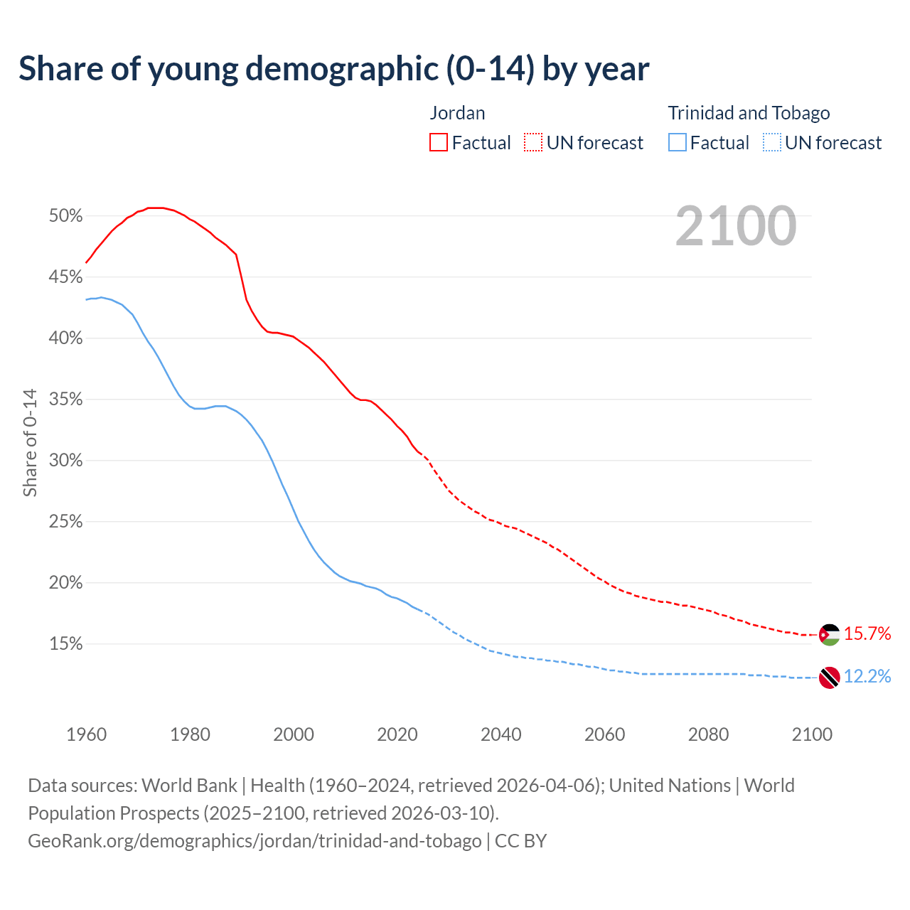 - The share of young demographic (0-15 years old) in Jordan is 30.7% vs 17.8% in Trinidad and Tobago.