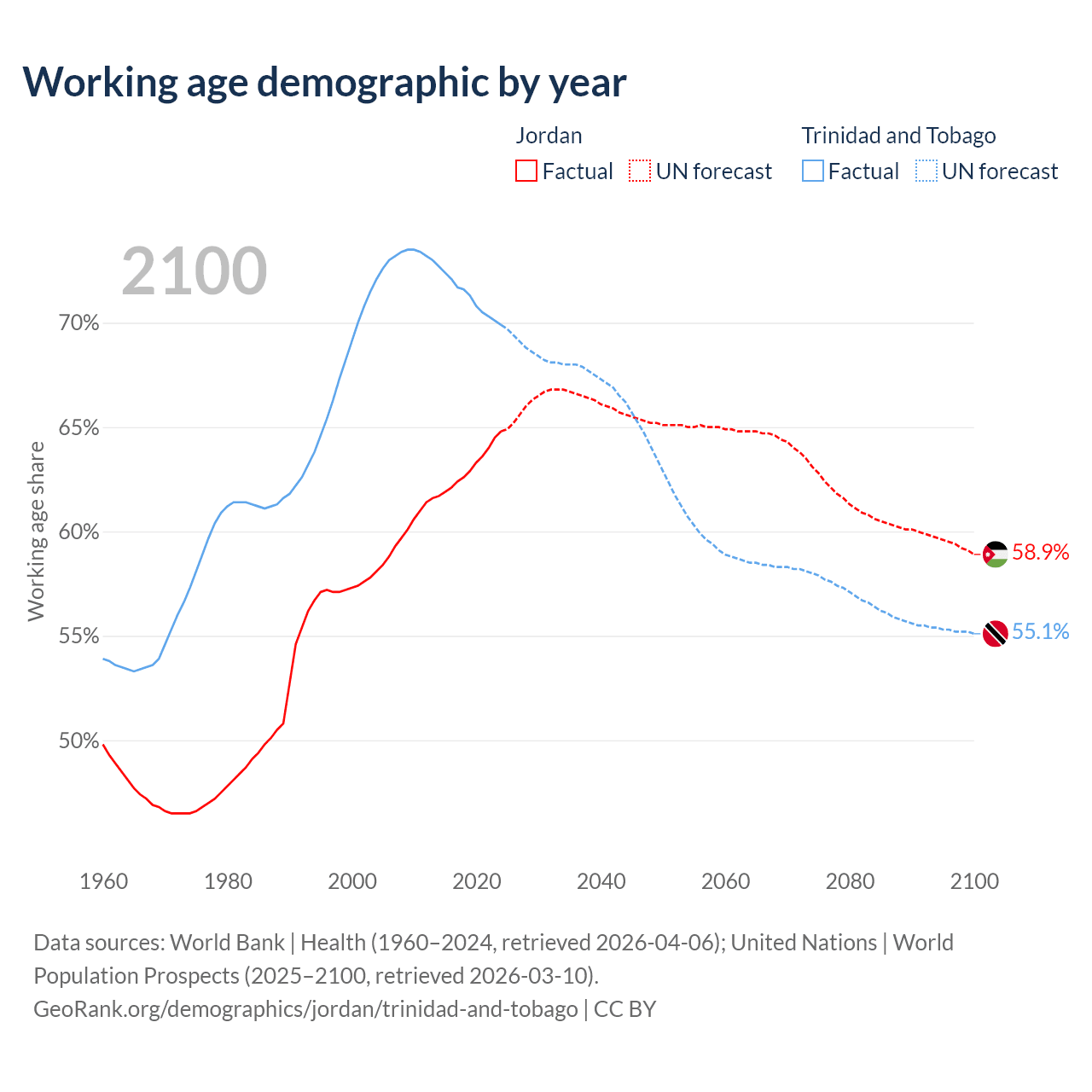 - Jordan has 7.49M working age adults (aged 15-64) vs 960K in Trinidad and Tobago.
