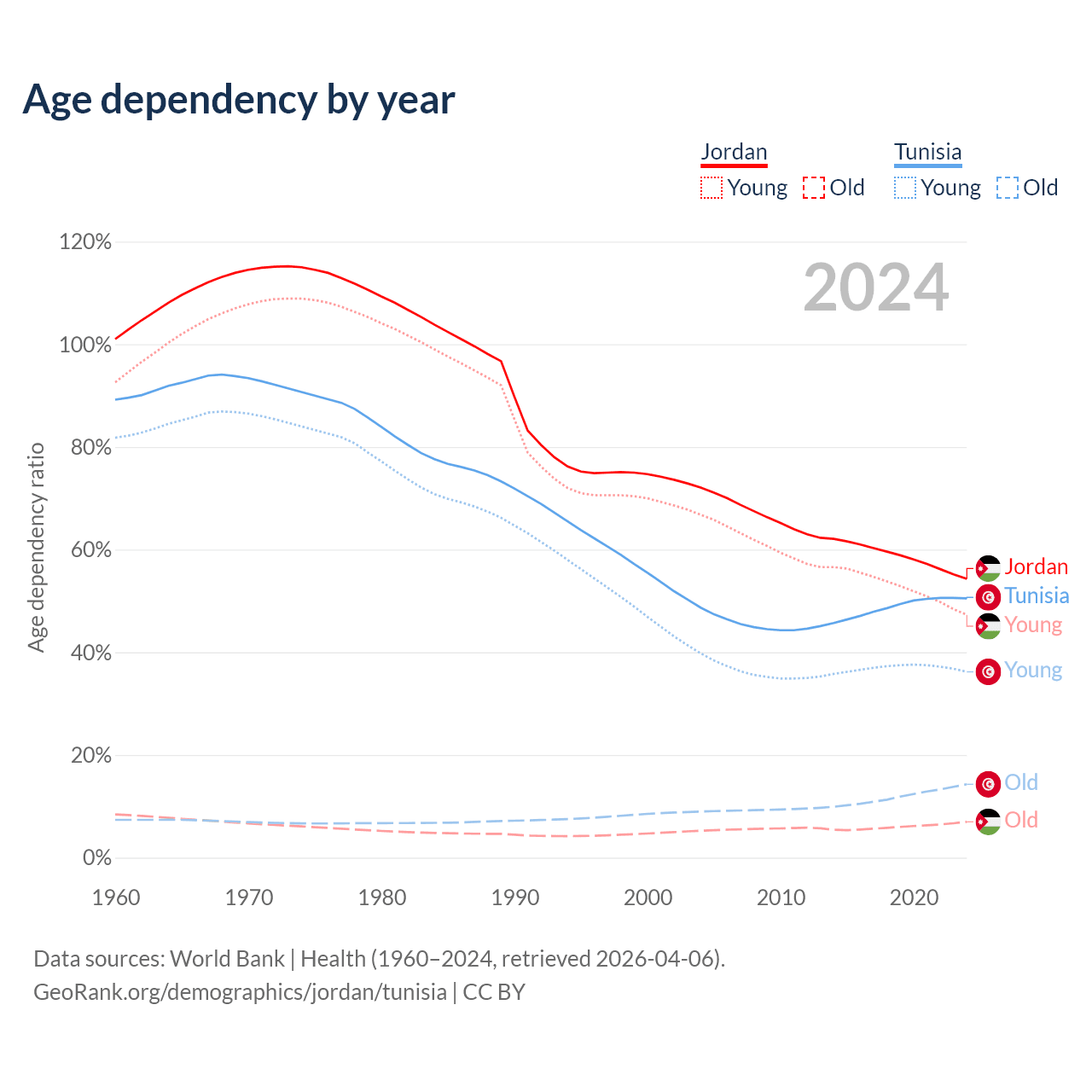 Data sources: World Bank | Health (1960–2024, retrieved 2026-04-06); U.S. Census Bureau (1960–2024, retrieved 2026-02-08).