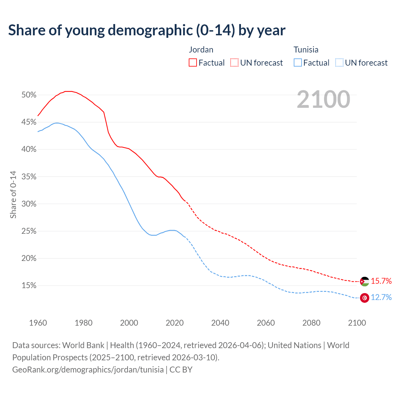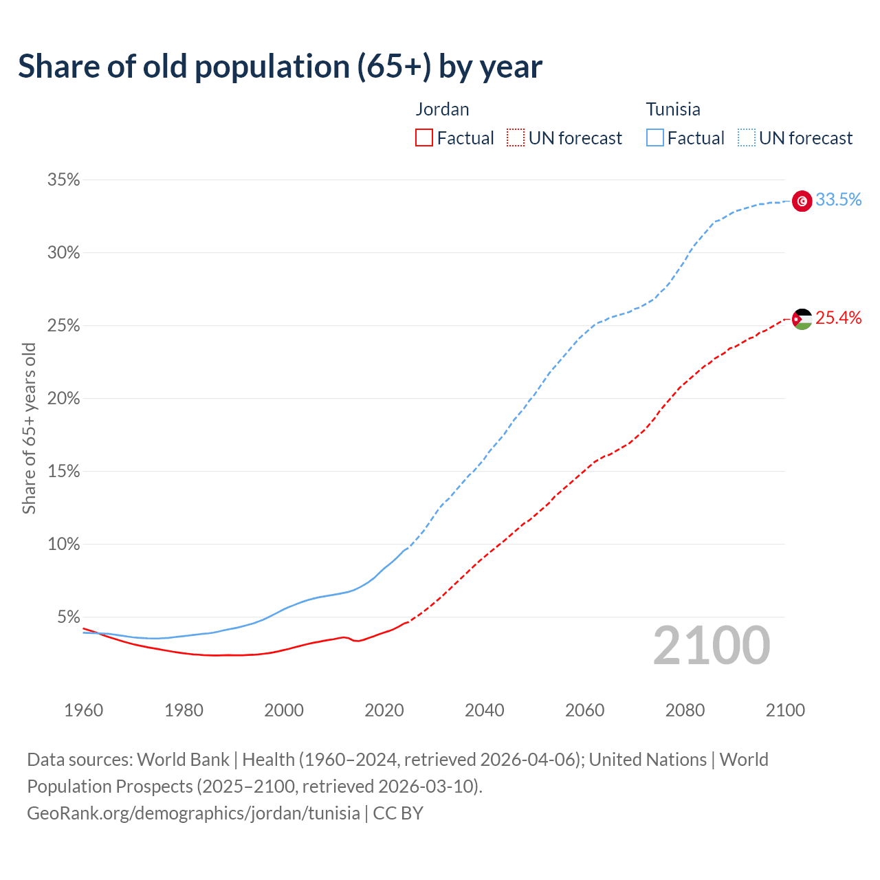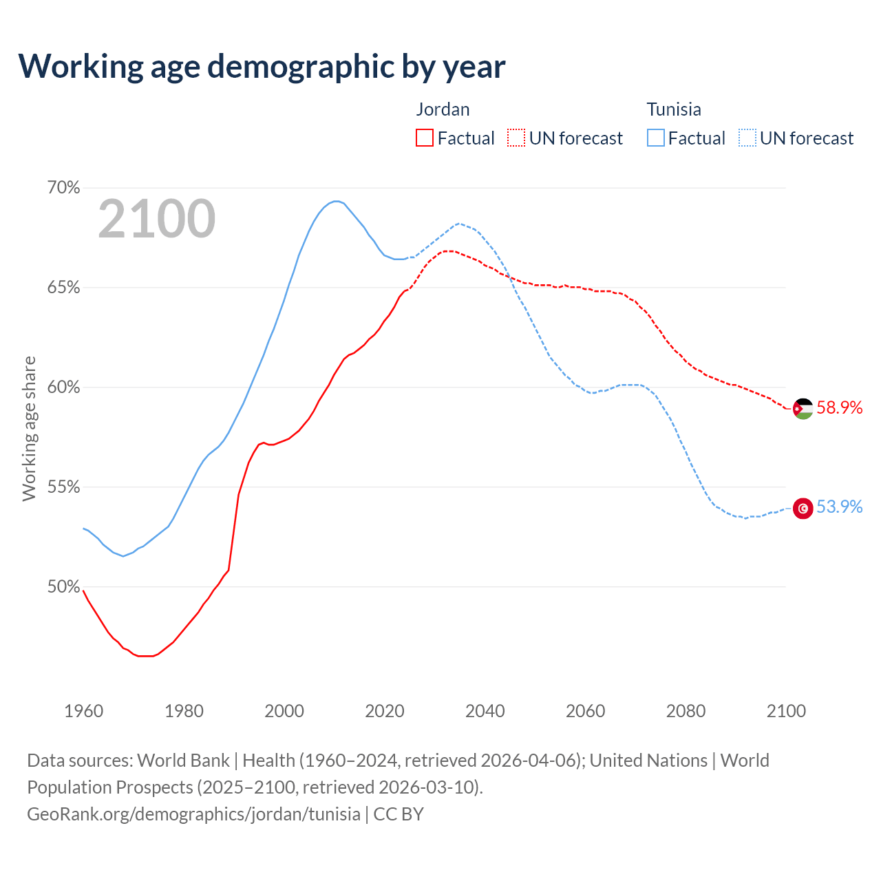 Median age Jordan vs Tunisia, 1960-2100