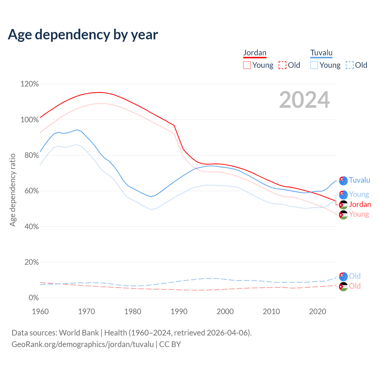 - The share of old-age demographic (65+) in Jordan is 4.52% vs 6.67% in Tuvalu.