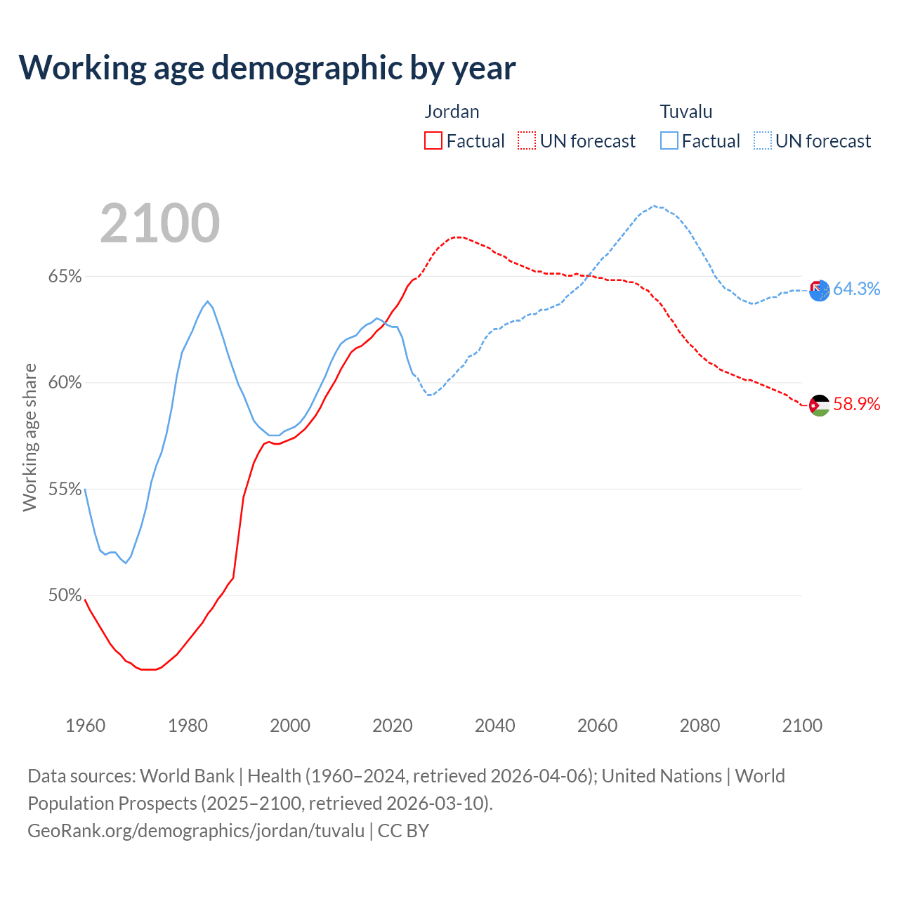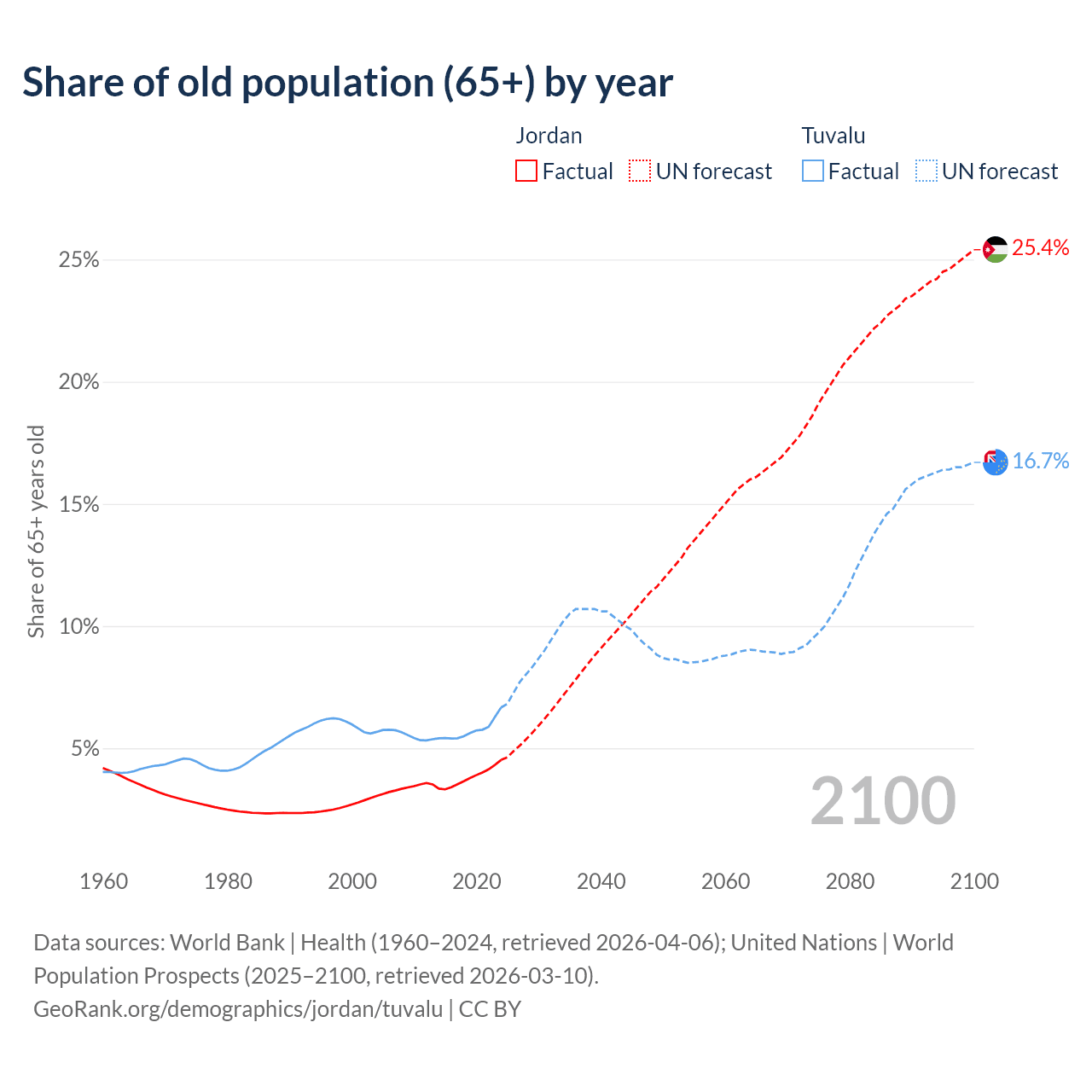 Median age Jordan vs Tuvalu, 1960-2100