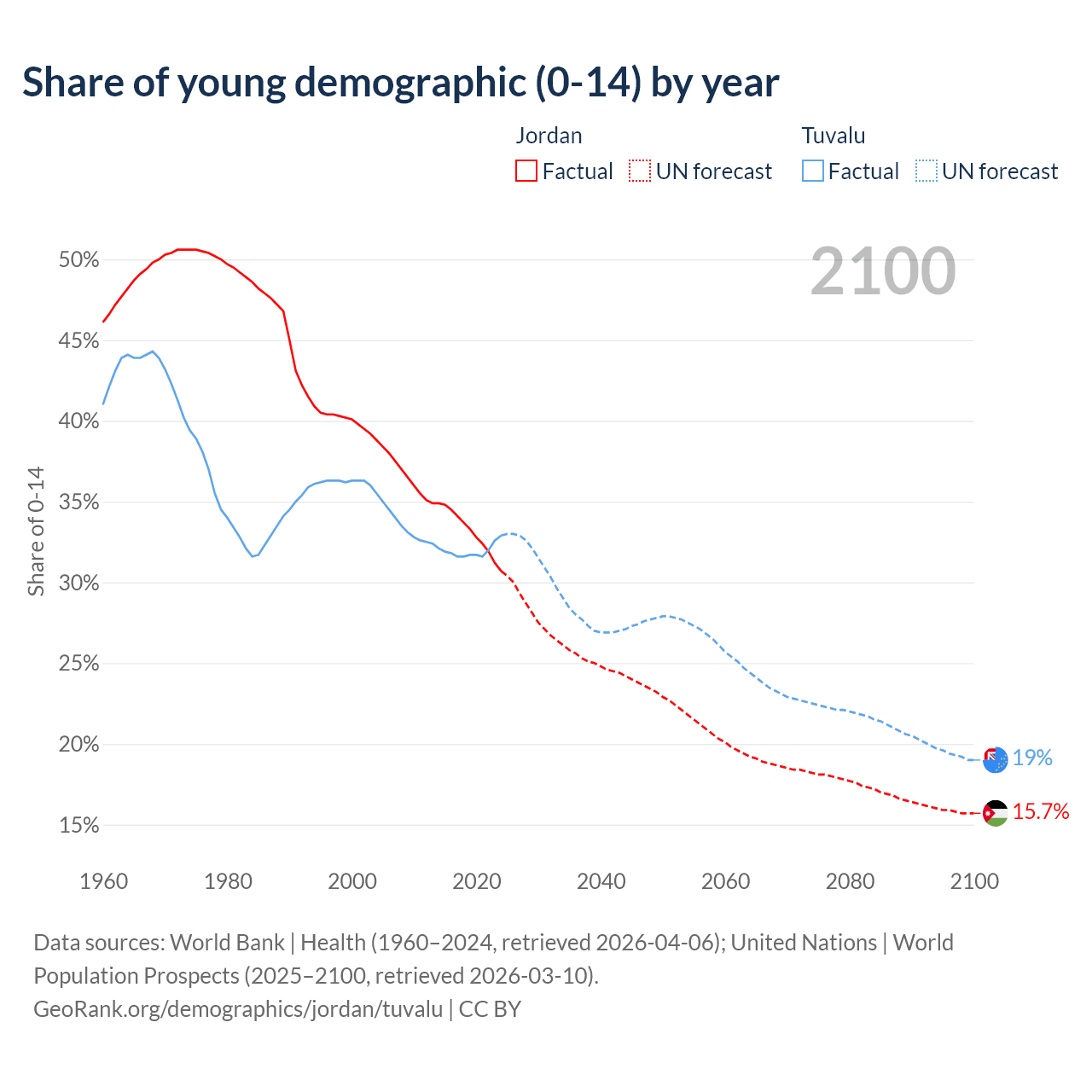 - The share of young demographic (0-15 years old) in Jordan is 30.7% vs 32.9% in Tuvalu.