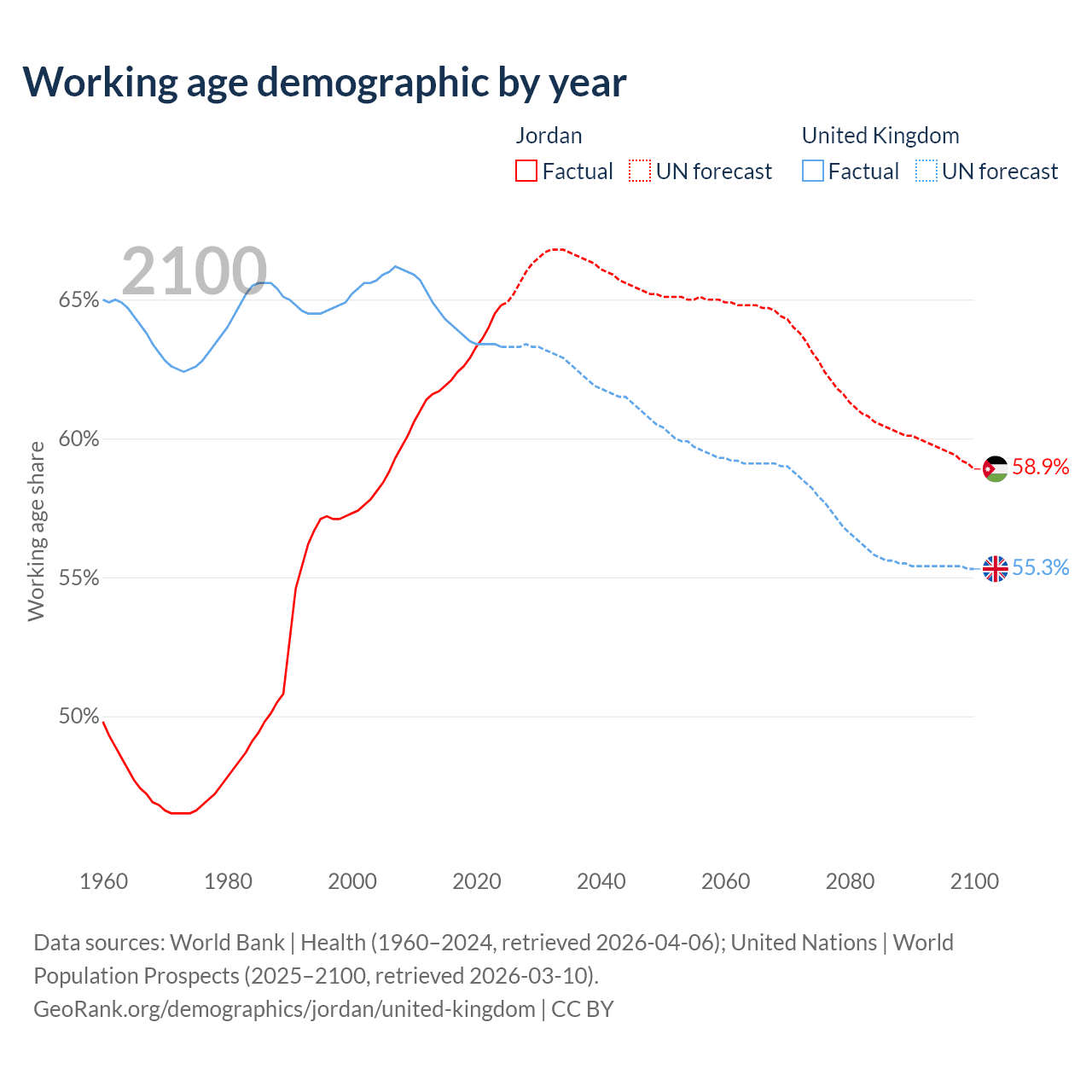 Median age Jordan vs United Kingdom, 1960-2100