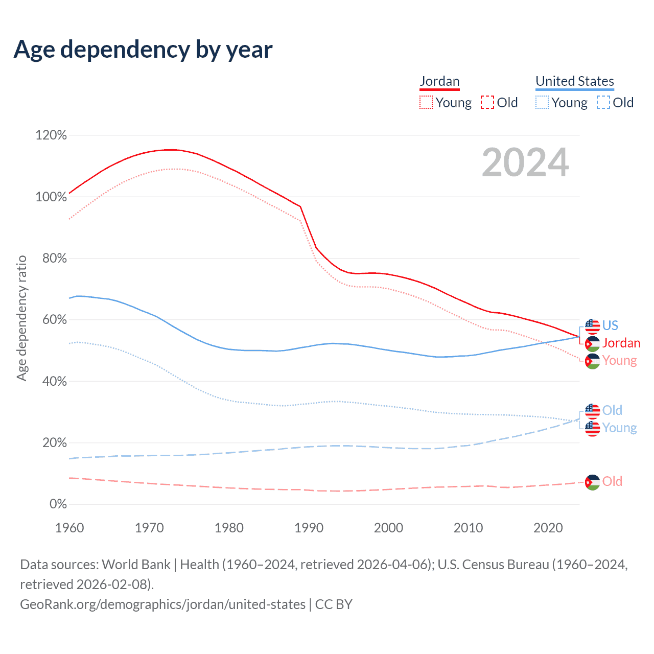 - The share of old-age demographic (65+) in Jordan is 4.52% vs 17.9% in the United States.
