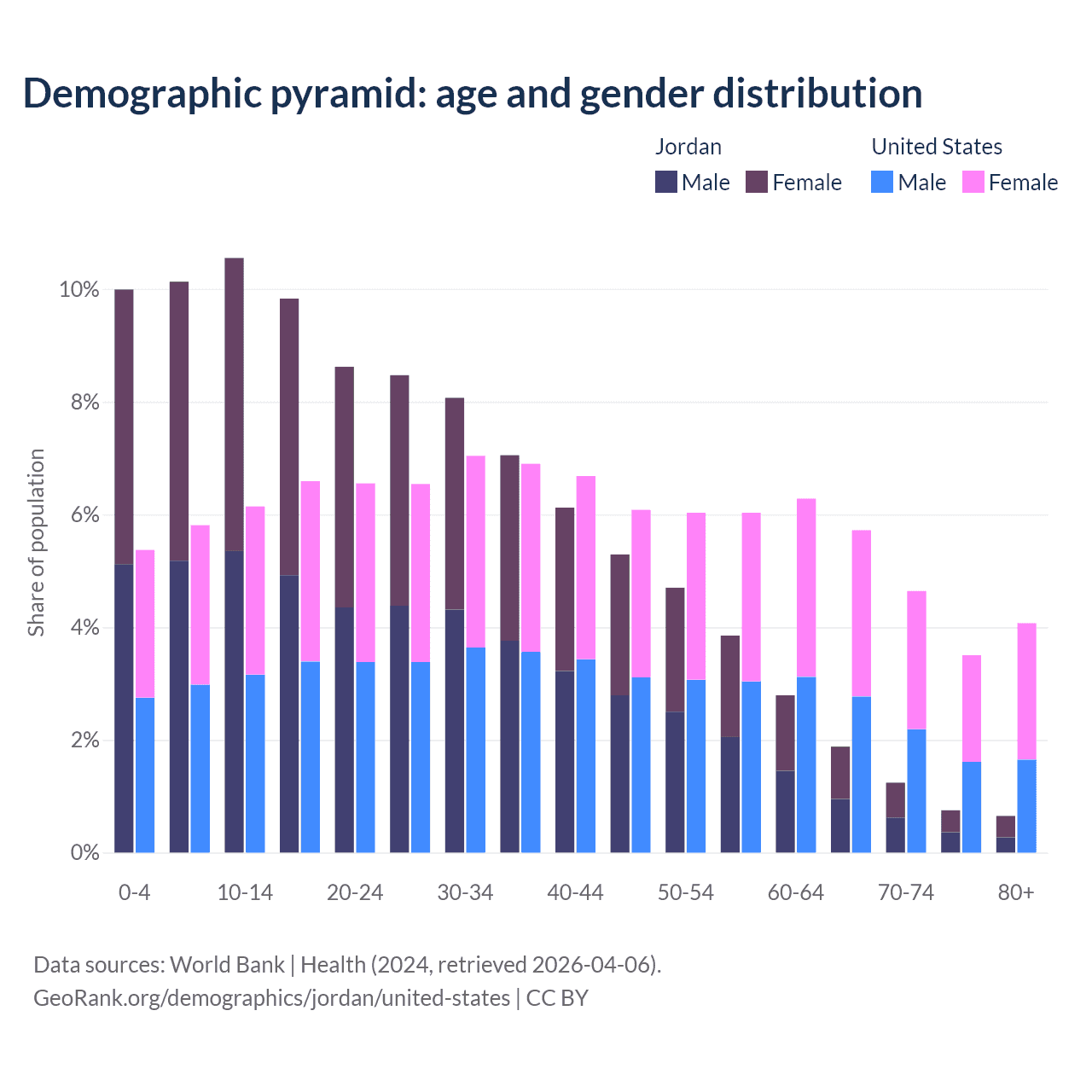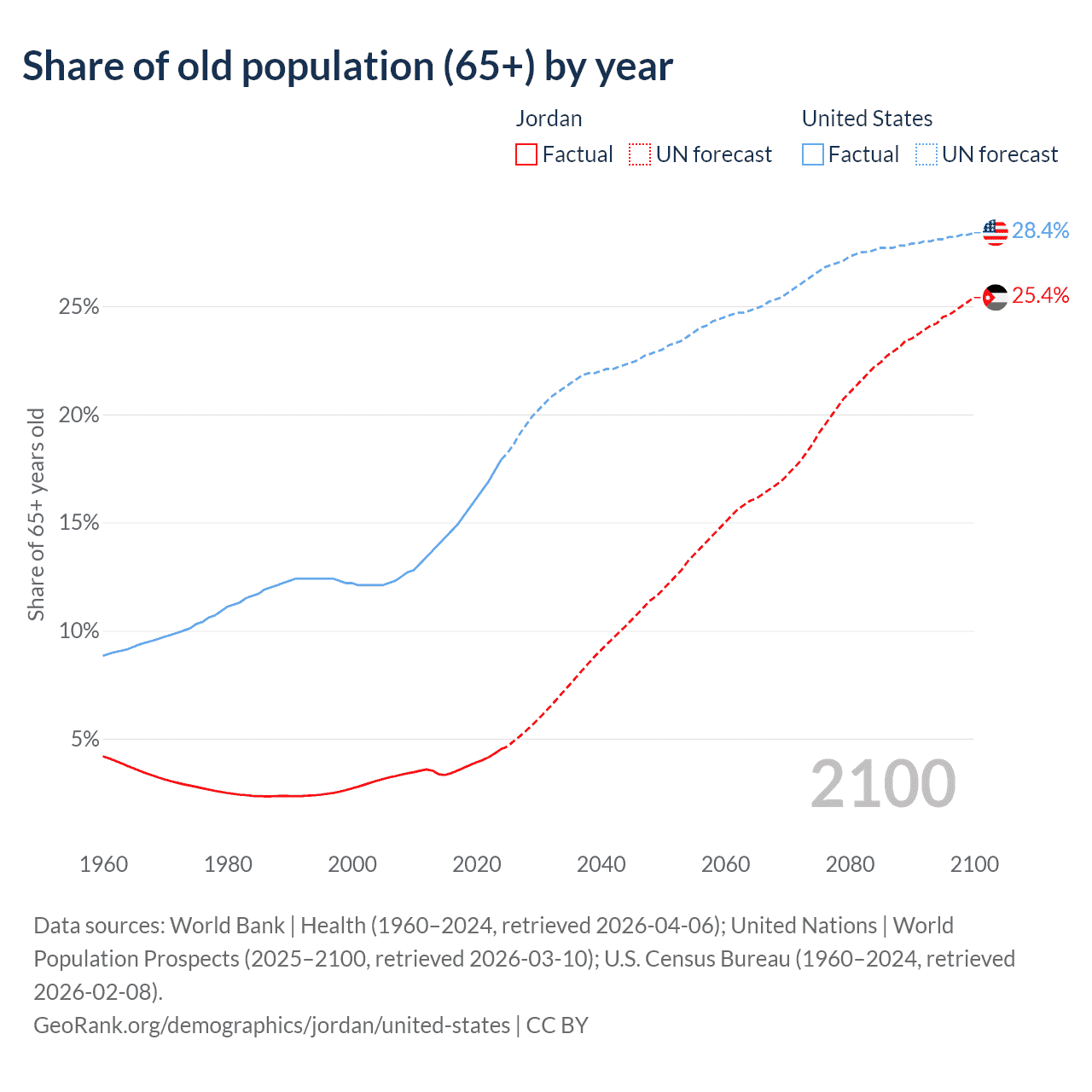 The share of older people aged 65 and over is 4.52% in Jordan and 17.9% in the United States. Life expectancy in Jordan compared to the United States .
