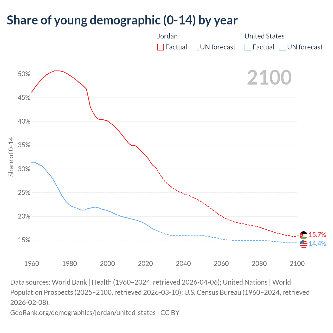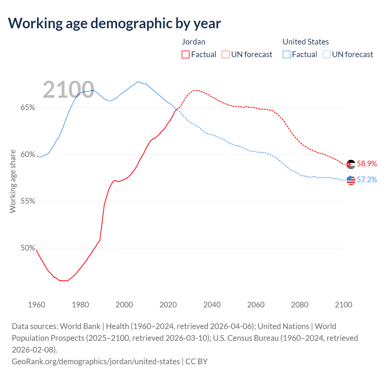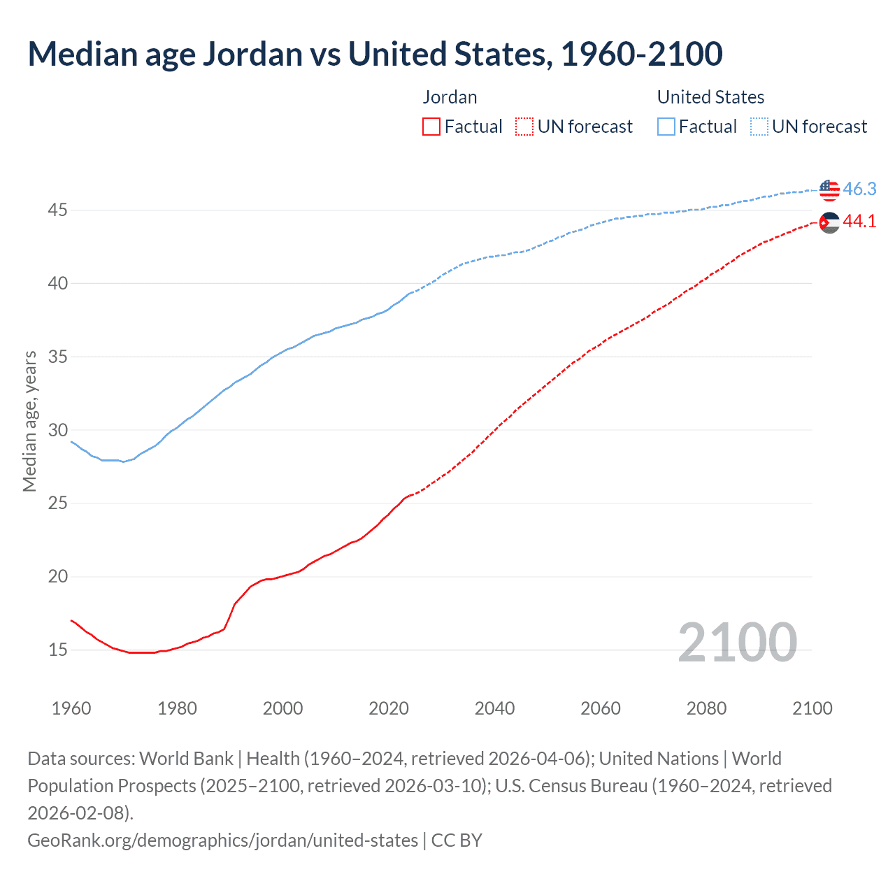 Median age Jordan vs United States, 1960-2100