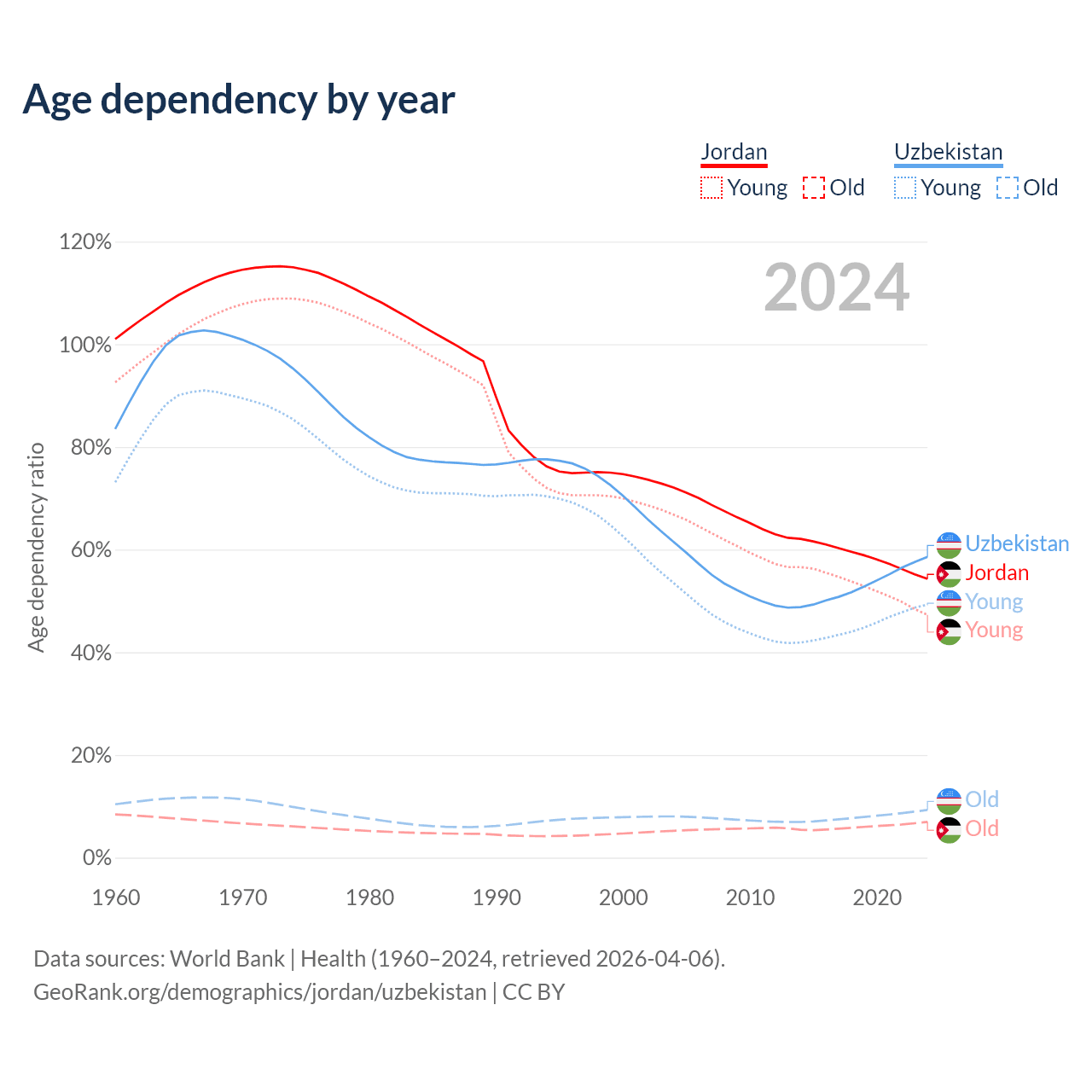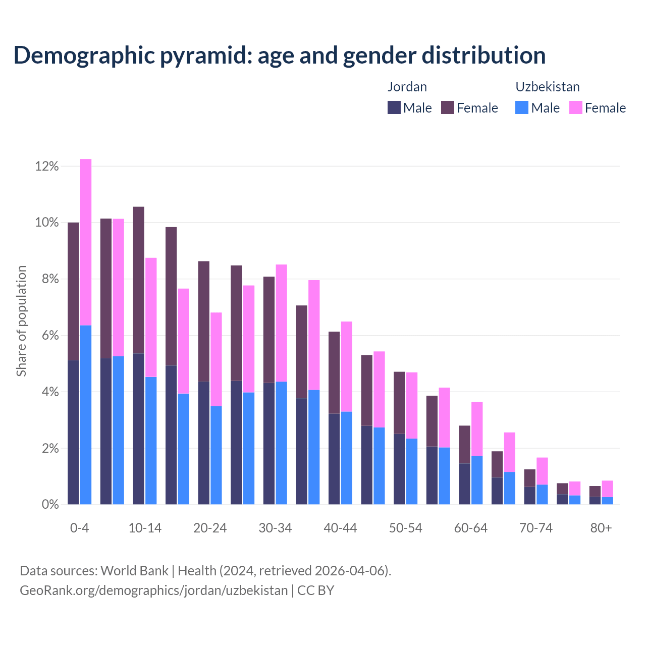 - Jordan is ranked 131/196 by median age (oldest to youngest) vs 116/196 for Uzbekistan.