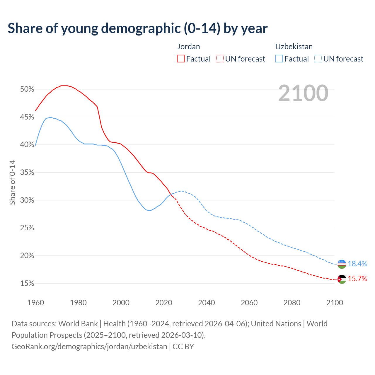 - The share of young demographic (0-15 years old) in Jordan is 30.7% vs 31.1% in Uzbekistan.