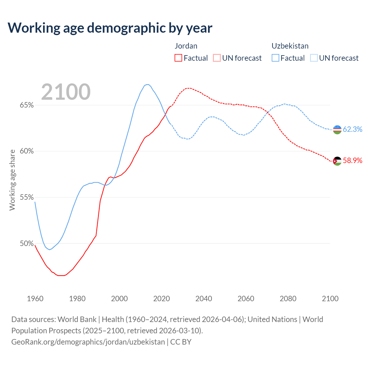 - Jordan has 7.49M working age adults (aged 15-64) vs 23.9M in Uzbekistan.