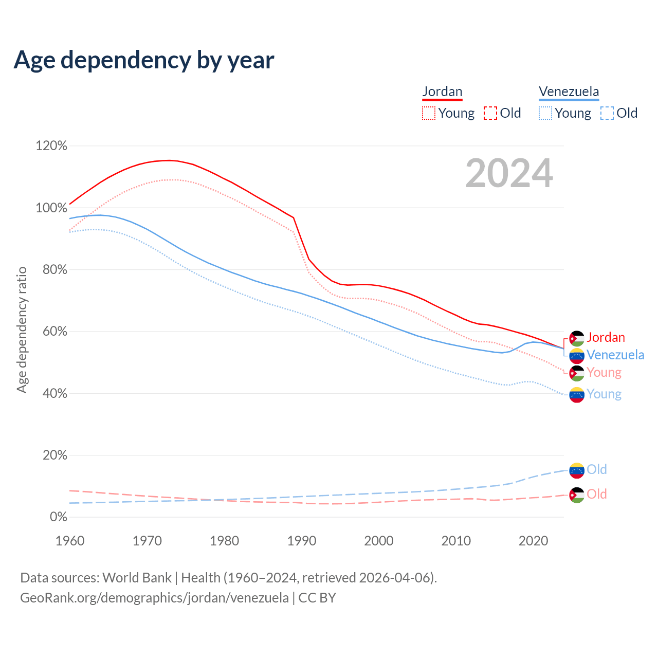- Jordan is ranked 131/196 by median age (oldest to youngest) vs 104/196 for Venezuela.