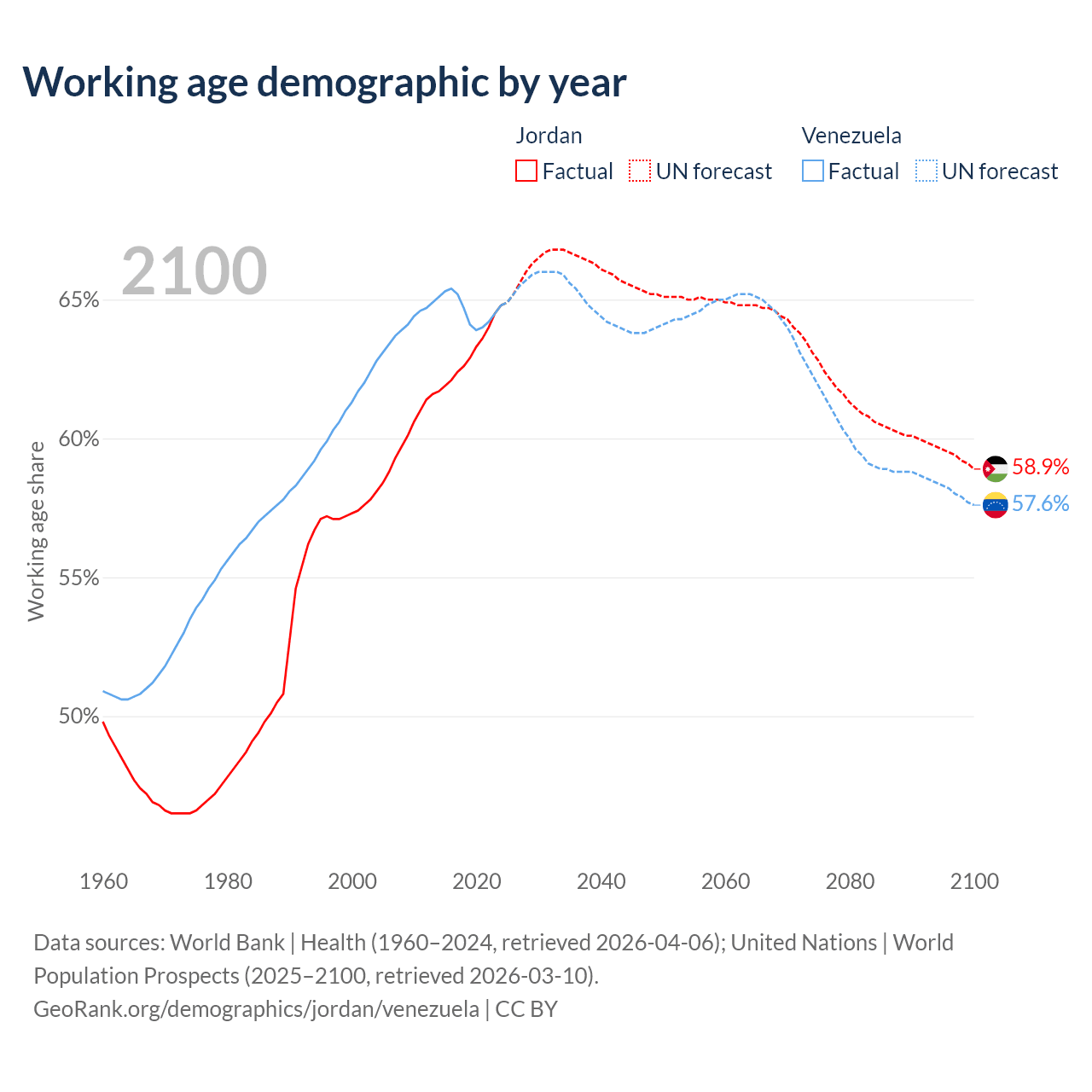 - Jordan has 7.49M working age adults (aged 15-64) vs 18.6M in Venezuela.