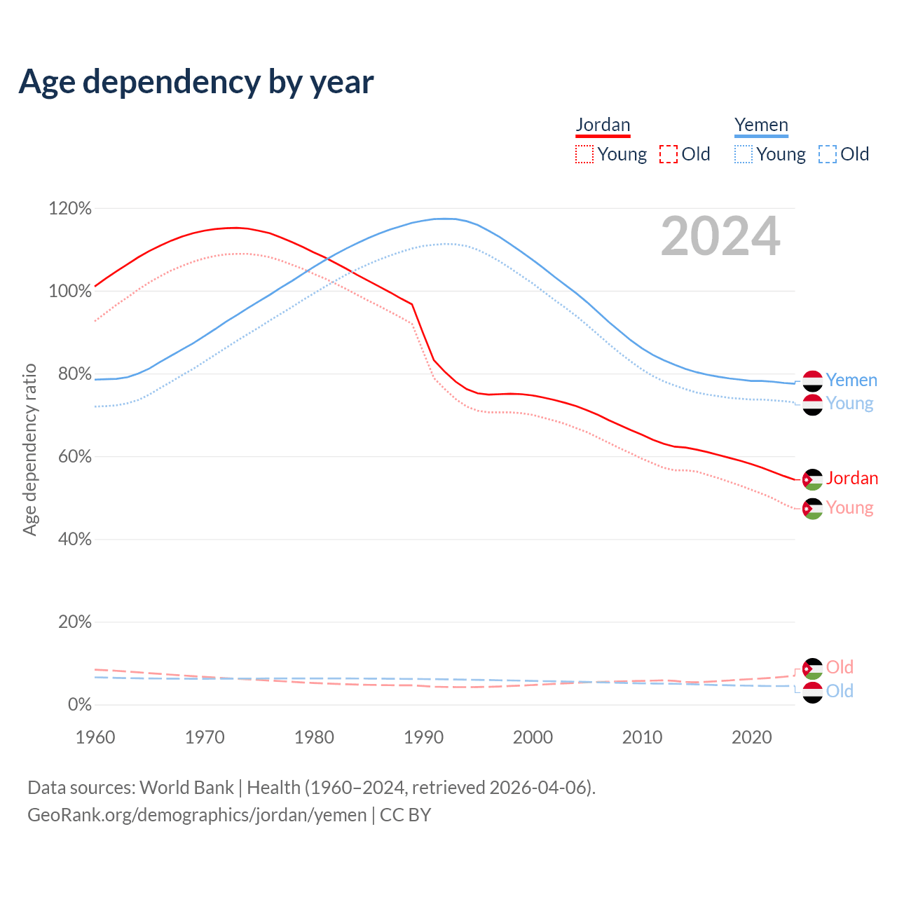 - Jordan is ranked 131/196 by median age (oldest to youngest) vs 174/196 for Yemen.
