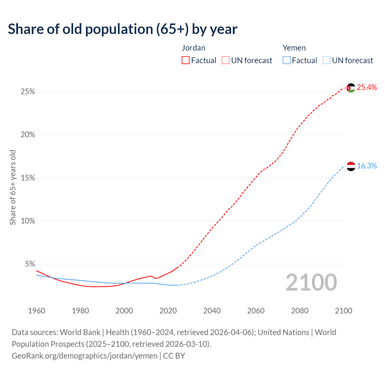 - The share of old-age demographic (65+) in Jordan is 4.52% vs 2.52% in Yemen.