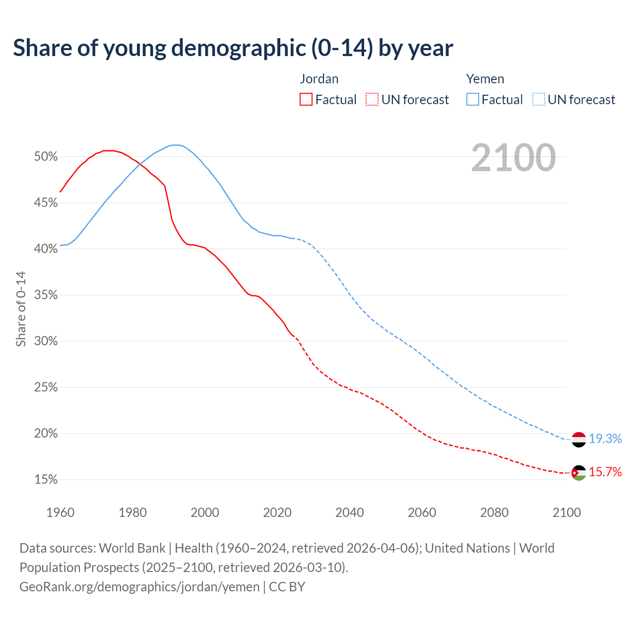 - As of 2026, the population of Jordan is 11.6M vs 43.3M in Yemen - 3.75 times difference.