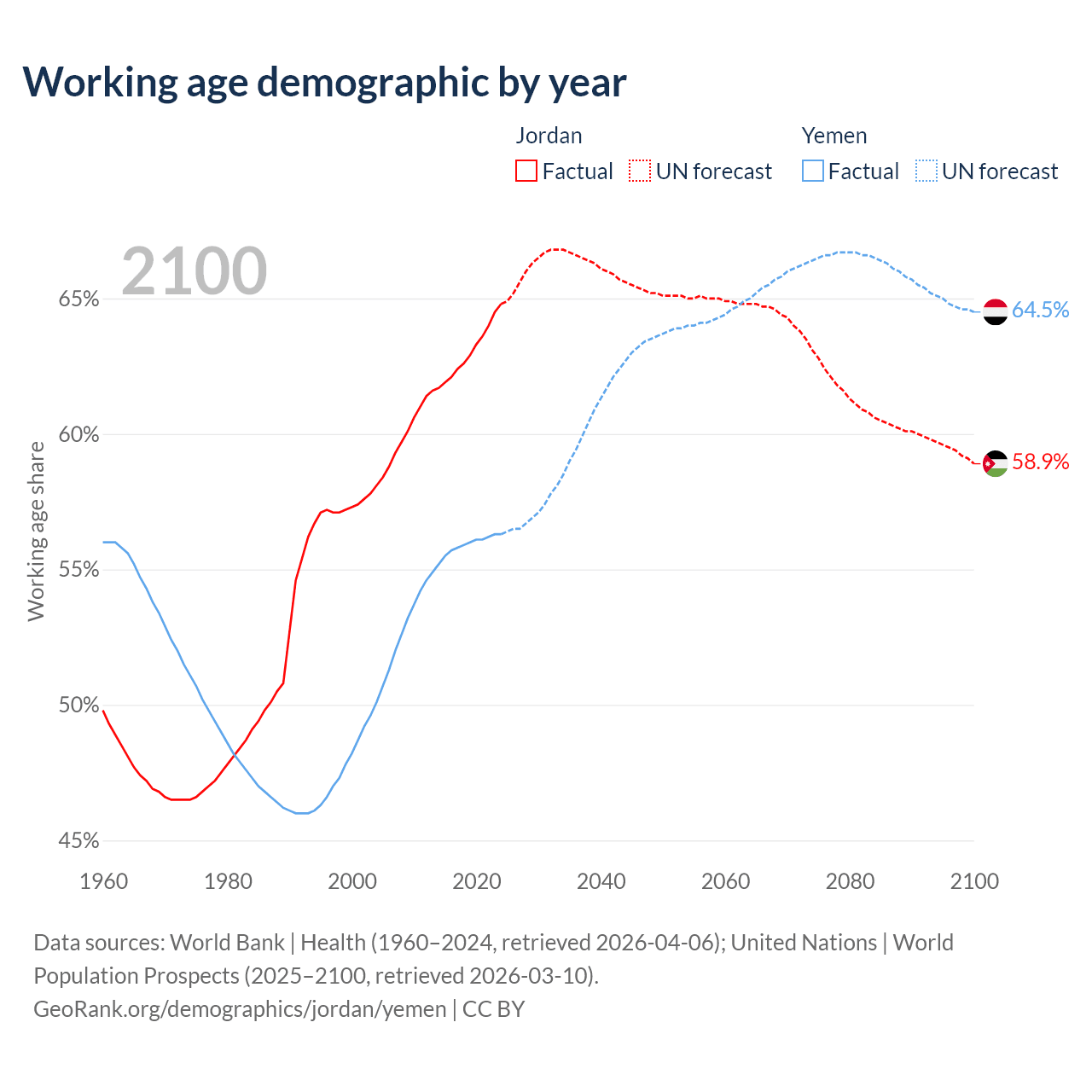 - Jordan has 7.49M working age adults (aged 15-64) vs 24.4M in Yemen.