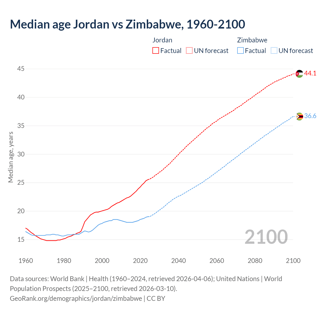 - The median age in Jordan is 25.5 years compared to 19 years in Zimbabwe.