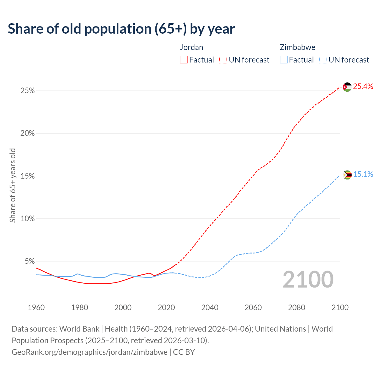The share of older people aged 65 and over is 4.52% in Jordan and 3.6% in Zimbabwe. Life expectancy in Jordan compared to Zimbabwe .
