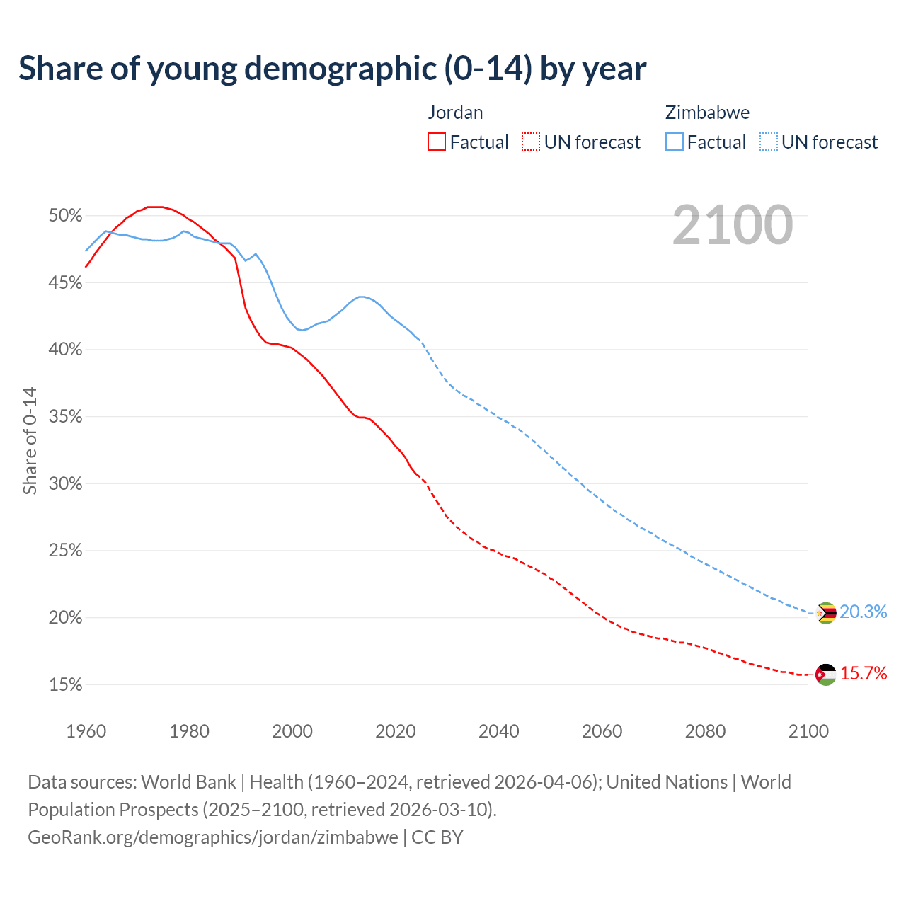 - Jordan is ranked 131/196 by median age (oldest to youngest) vs 177/196 for Zimbabwe.