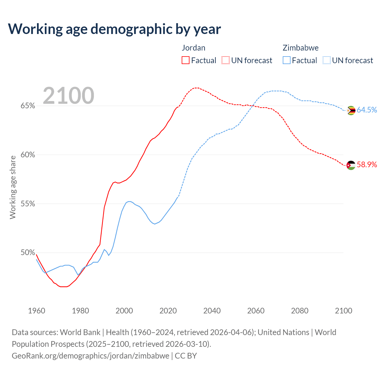 - Jordan has 7.49M working age adults (aged 15-64) vs 9.64M in Zimbabwe.