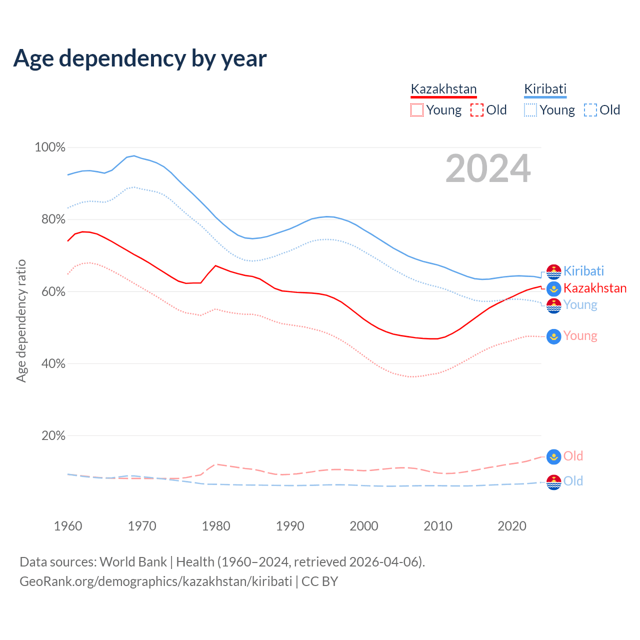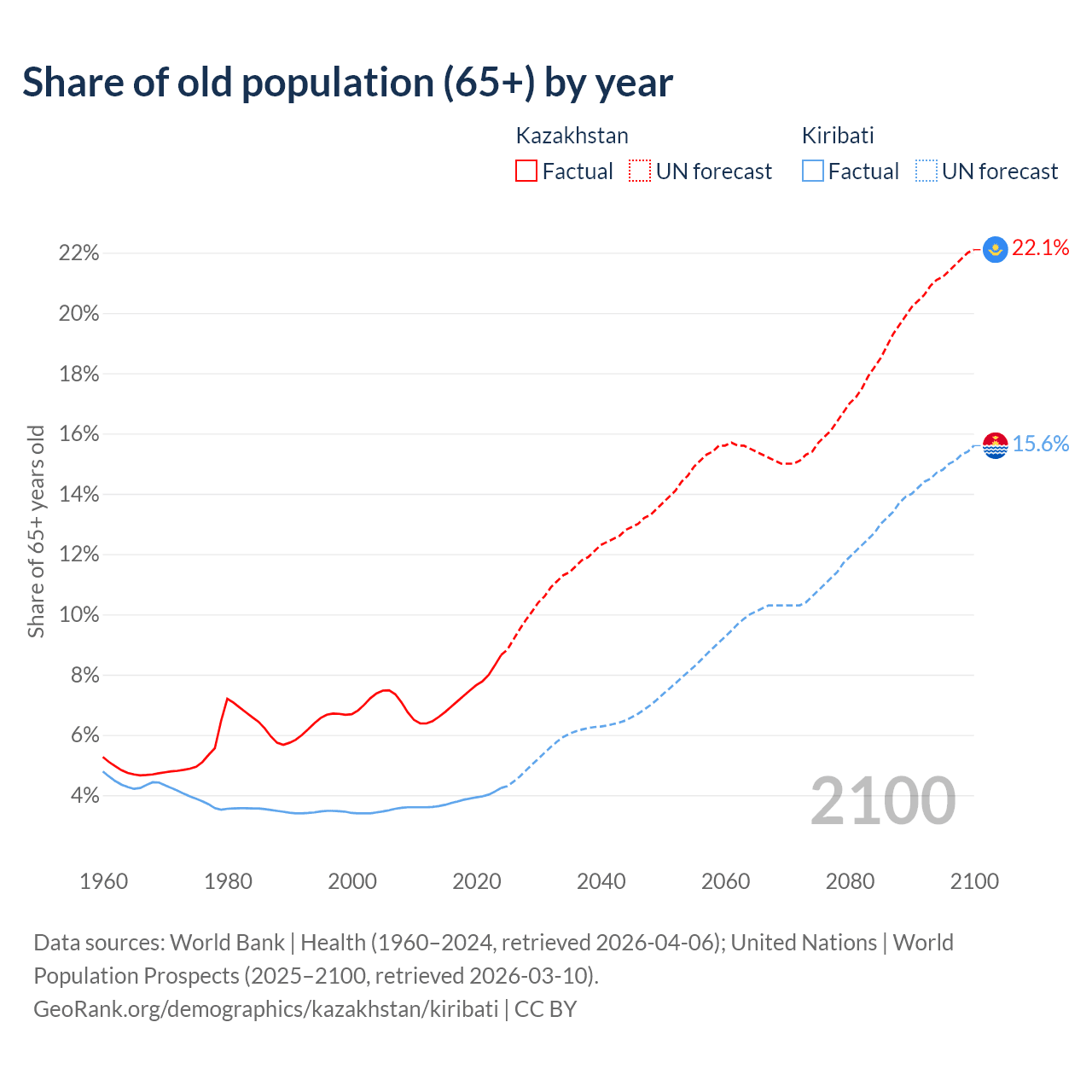 - The share of old-age demographic (65+) in Kazakhstan is 8.65% vs 4.24% in Kiribati.
