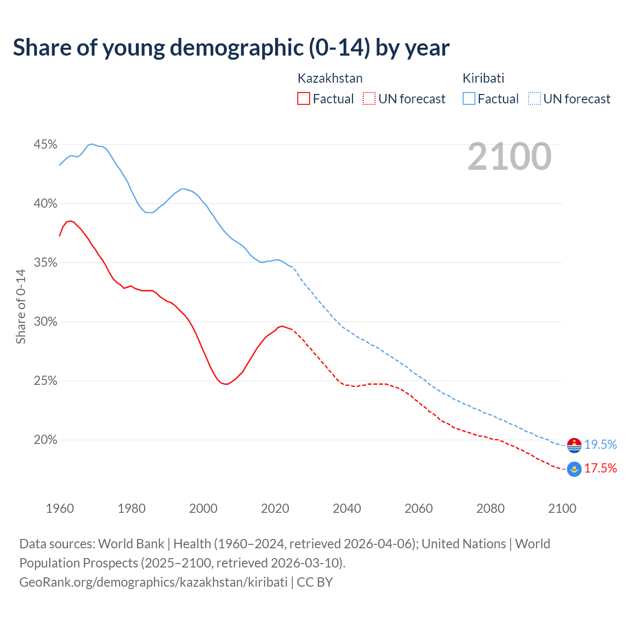 - The share of young demographic (0-15 years old) in Kazakhstan is 29.4% vs 34.7% in Kiribati.
