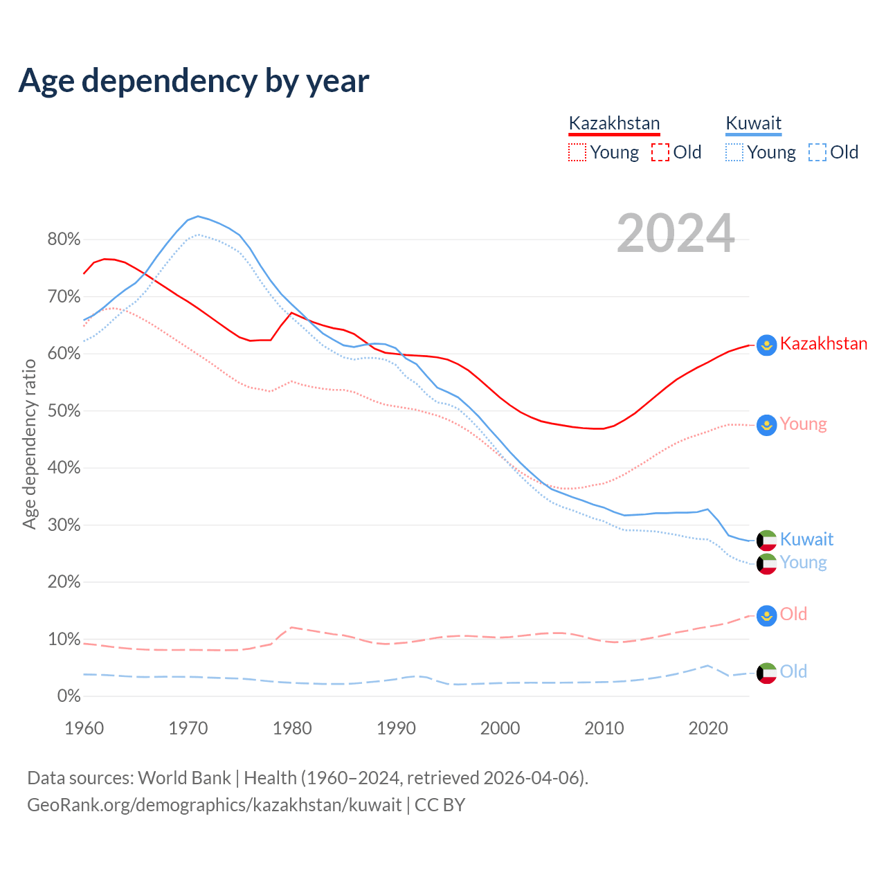 Data sources: World Bank | Health (1960–2024, retrieved 2026-04-06); U.S. Census Bureau (1960–2024, retrieved 2026-02-08).