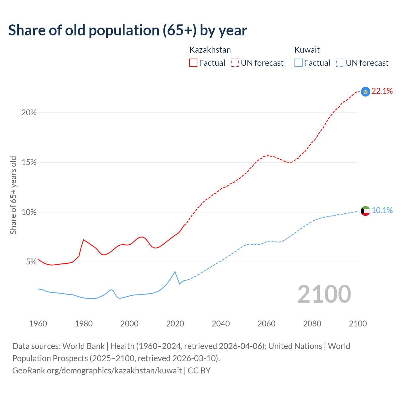 The share of older people aged 65 and over is 8.65% in Kazakhstan and 3.1% in Kuwait. Life expectancy in Kazakhstan compared to Kuwait .