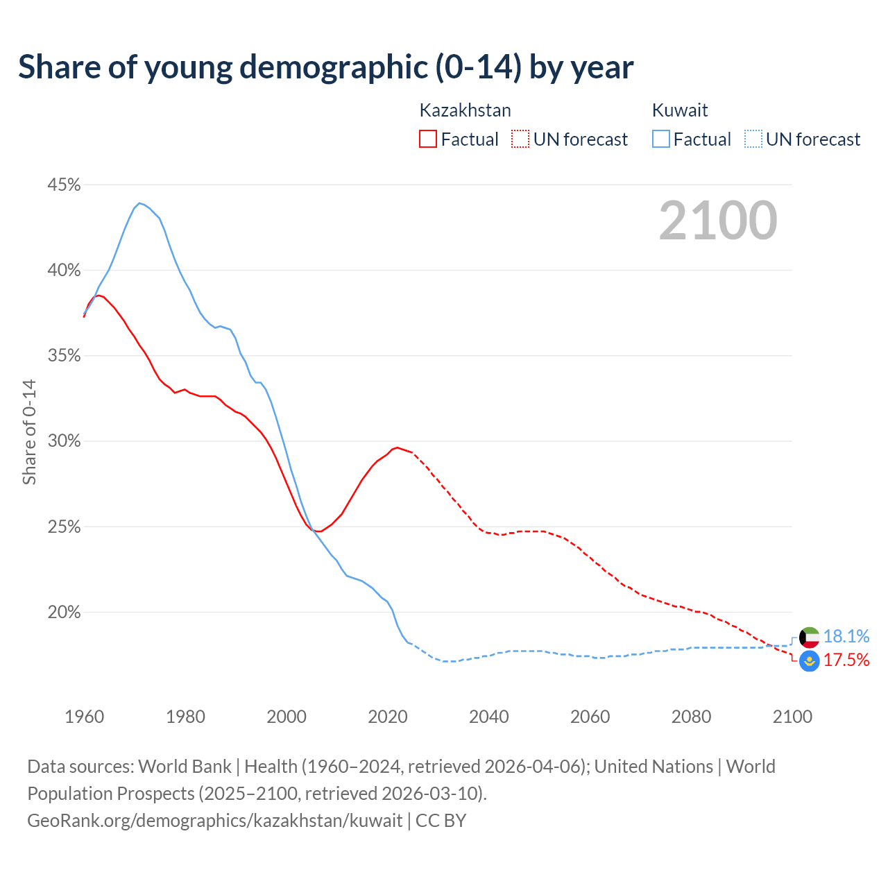 Median age Kazakhstan vs Kuwait, 1960-2100