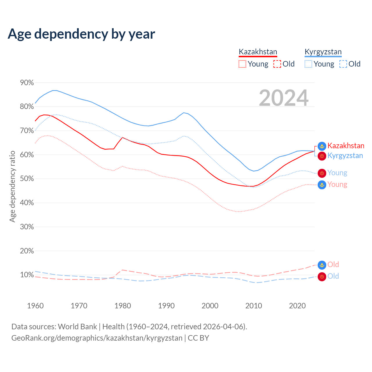 Data sources: World Bank | Health (1960–2024, retrieved 2026-04-06); U.S. Census Bureau (1960–2024, retrieved 2026-02-08).