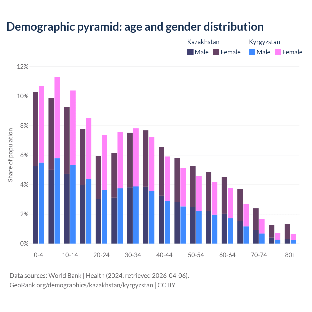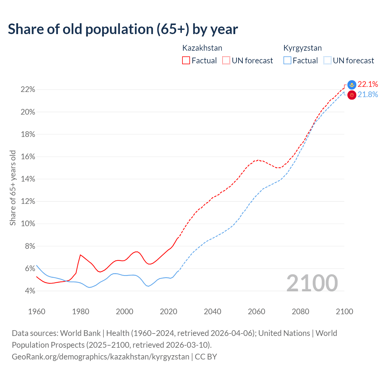 The share of older people aged 65 and over is 8.65% in Kazakhstan and 5.68% in Kyrgyzstan. Life expectancy in Kazakhstan compared to Kyrgyzstan .
