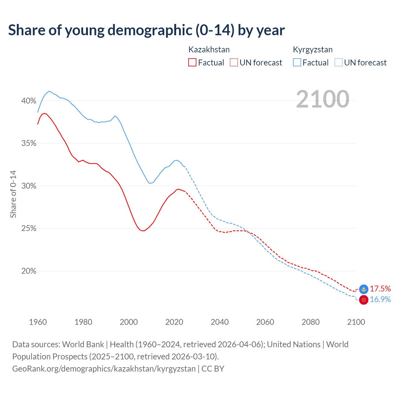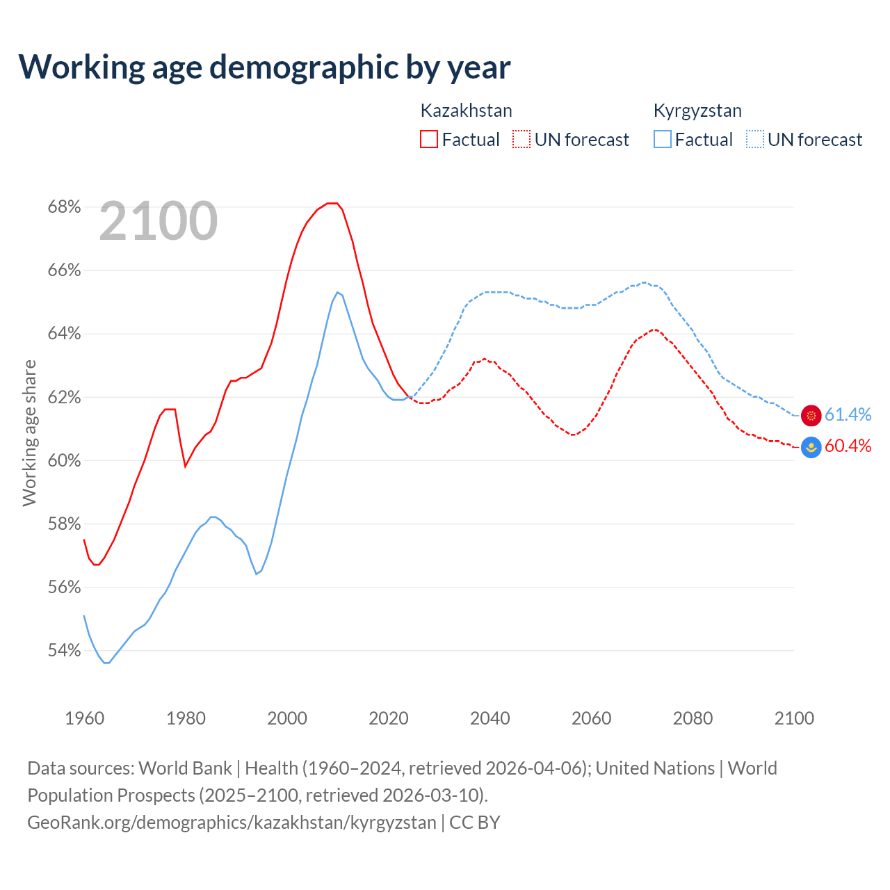Median age Kazakhstan vs Kyrgyzstan, 1960-2100