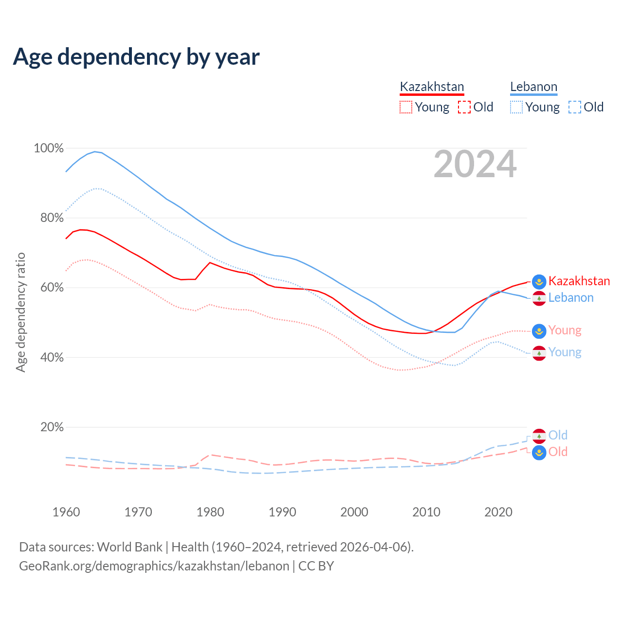 Data sources: World Bank | Health (1960–2024, retrieved 2026-04-06); U.S. Census Bureau (1960–2024, retrieved 2026-02-08).