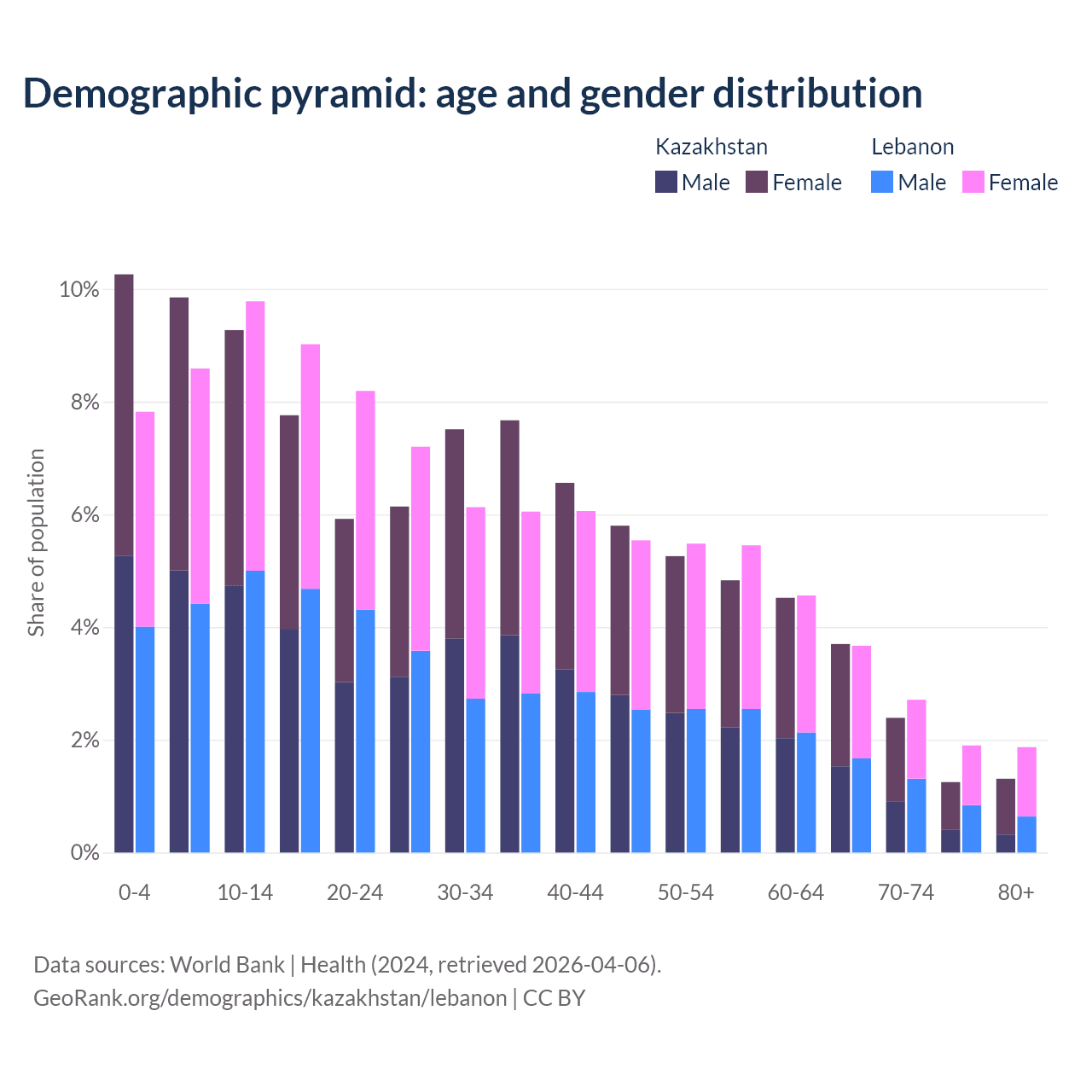 - Kazakhstan is ranked 99/196 by median age (oldest to youngest) vs 106/196 for Lebanon.