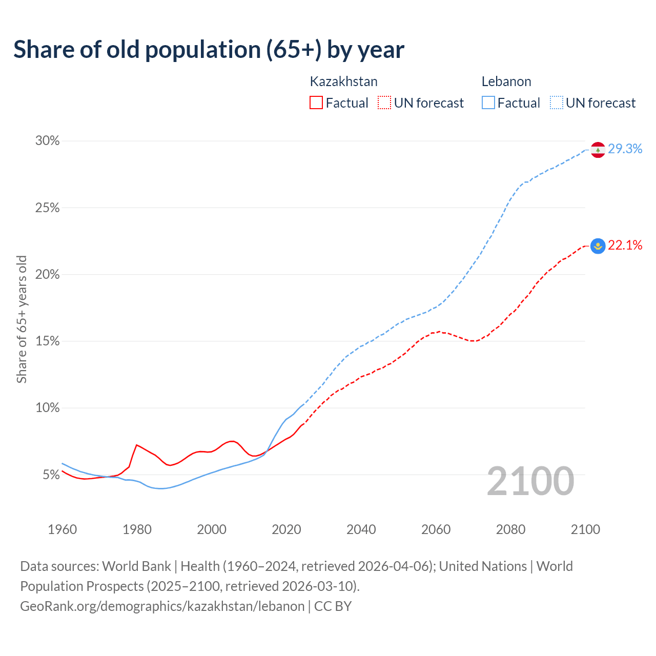The share of older people aged 65 and over is 8.65% in Kazakhstan and 10.1% in Lebanon. Life expectancy in Kazakhstan compared to Lebanon .
