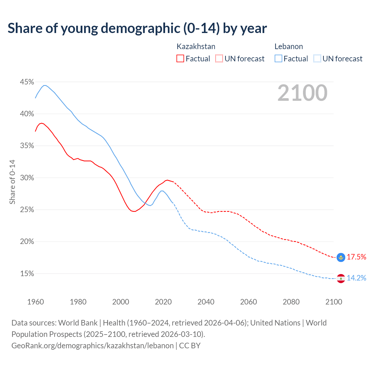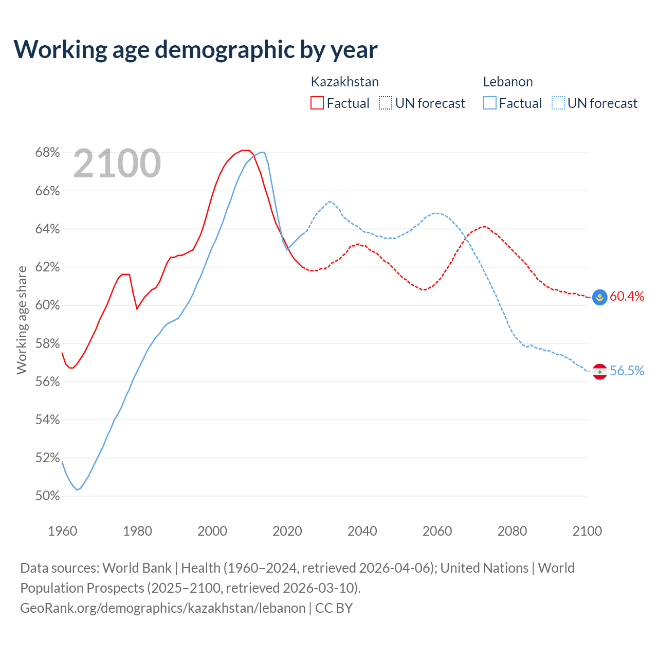 Median age Kazakhstan vs Lebanon, 1960-2100
