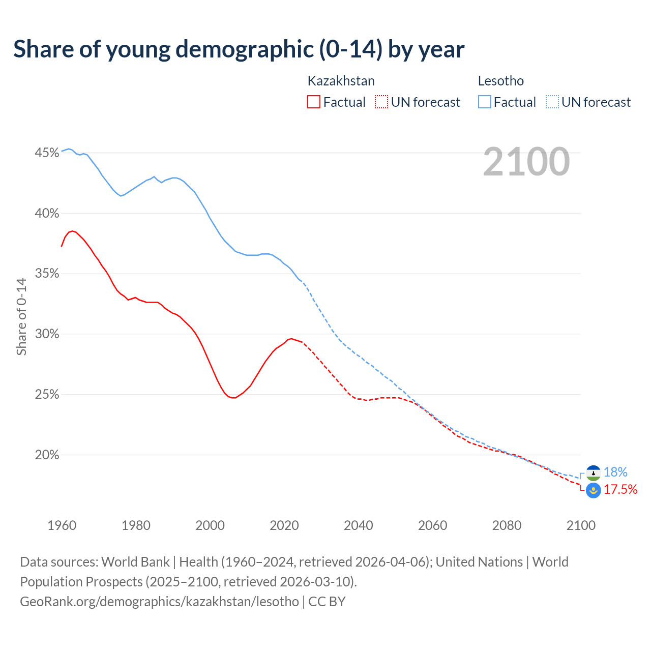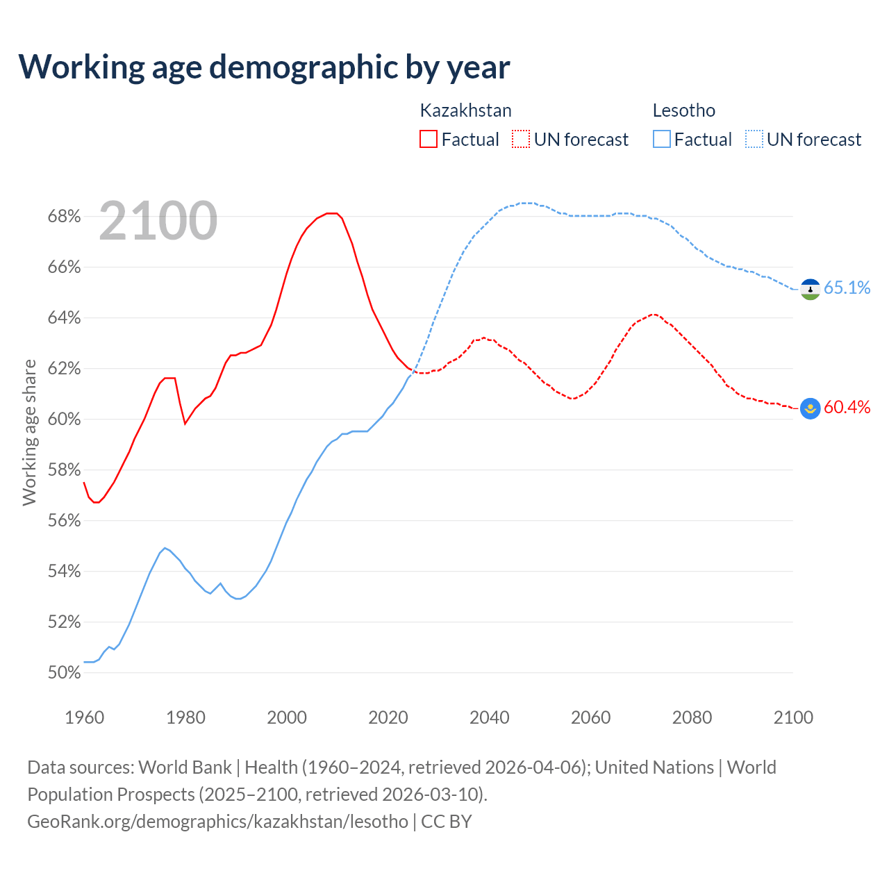 Median age Kazakhstan vs Lesotho, 1960-2100