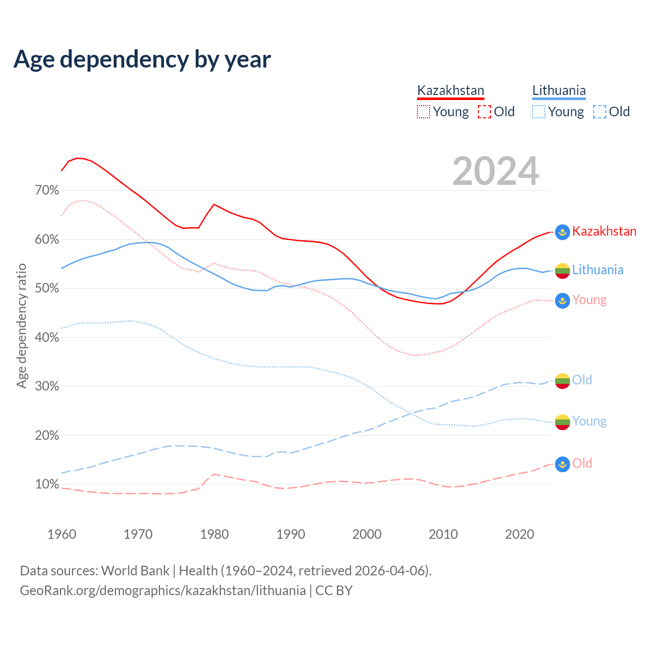 - World Bank | Health (1960–2024, retrieved 2026-04-06)