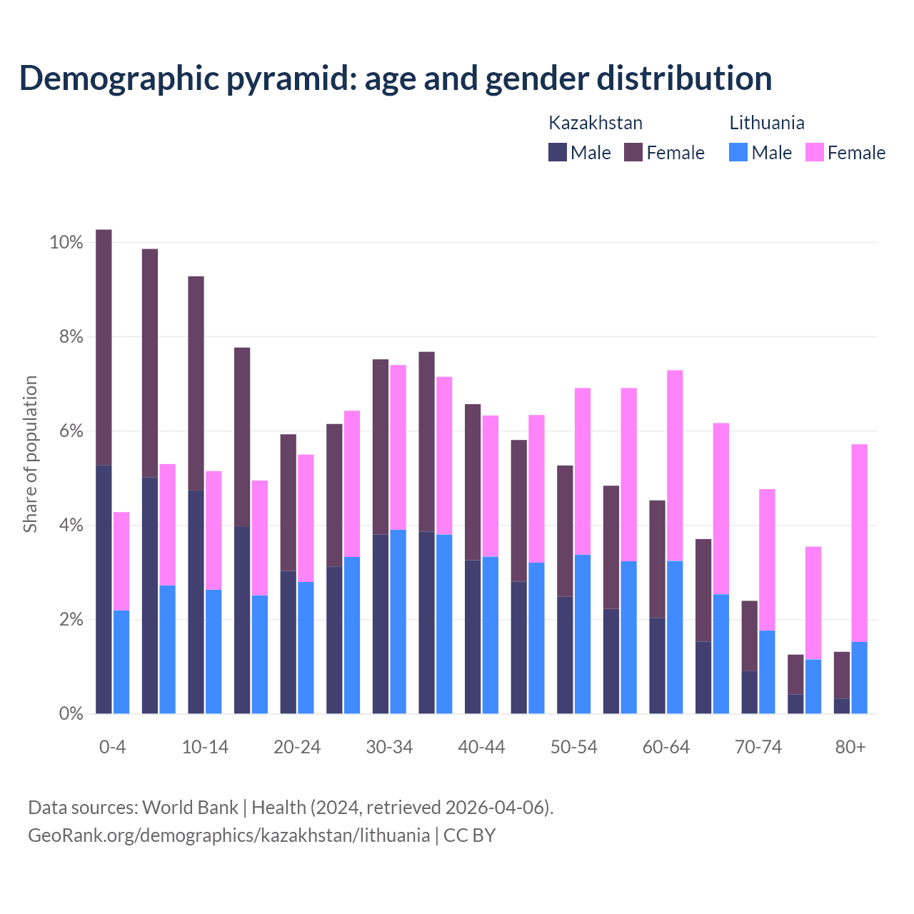 - Kazakhstan is ranked 99/196 by median age (oldest to youngest) vs 28/196 for Lithuania.