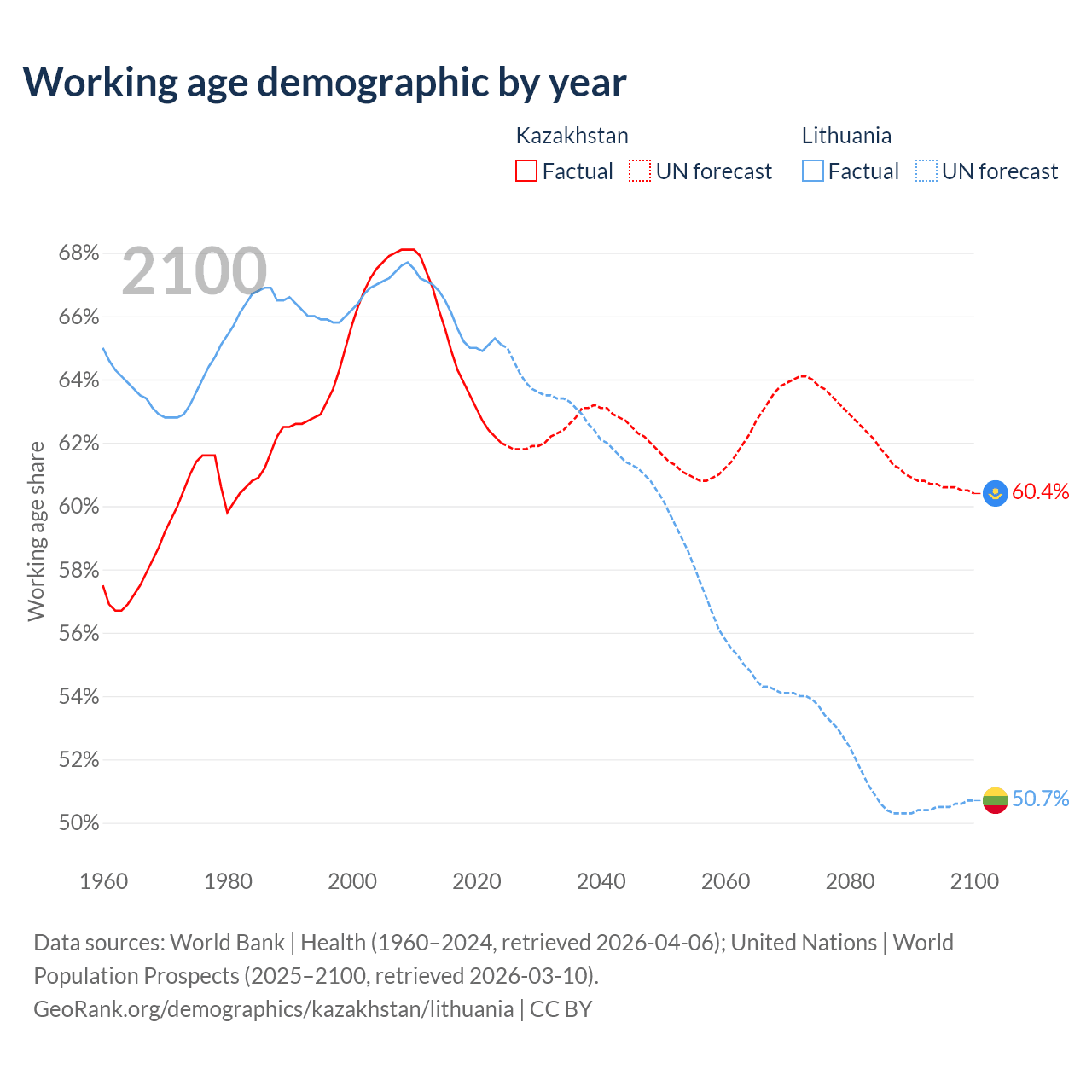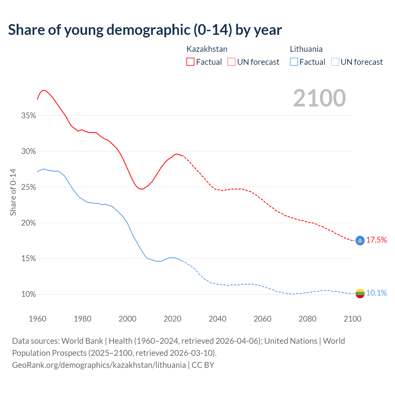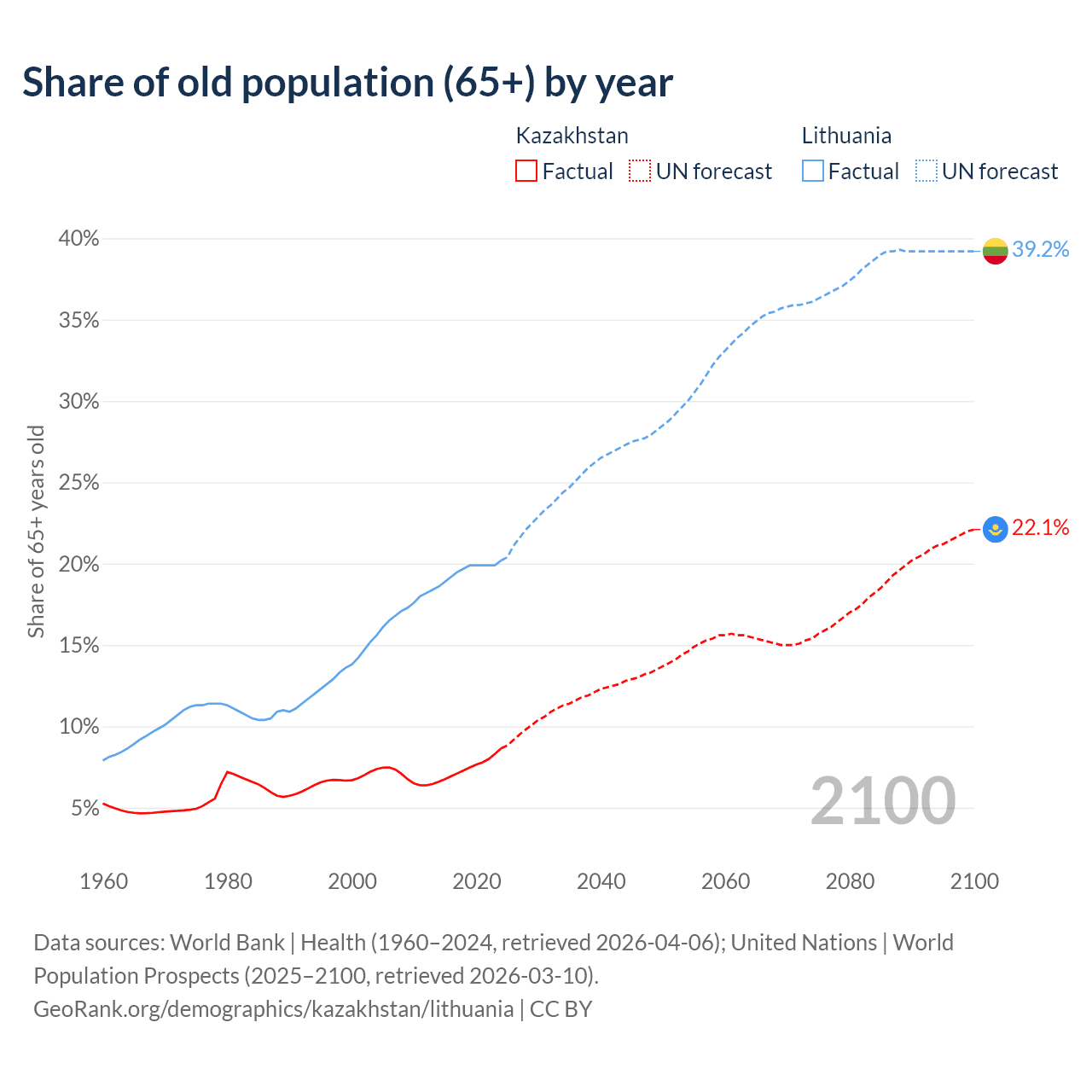 Median age Kazakhstan vs Lithuania, 1960-2100