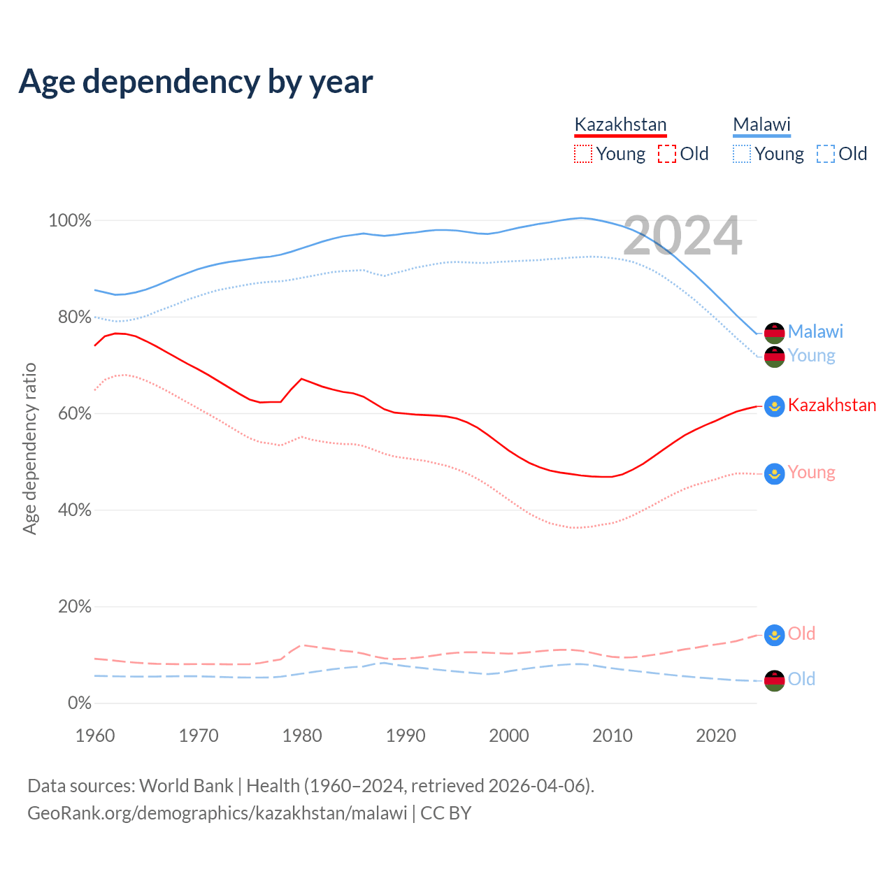 - Kazakhstan is ranked 99/196 by median age (oldest to youngest) vs 181/196 for Malawi.