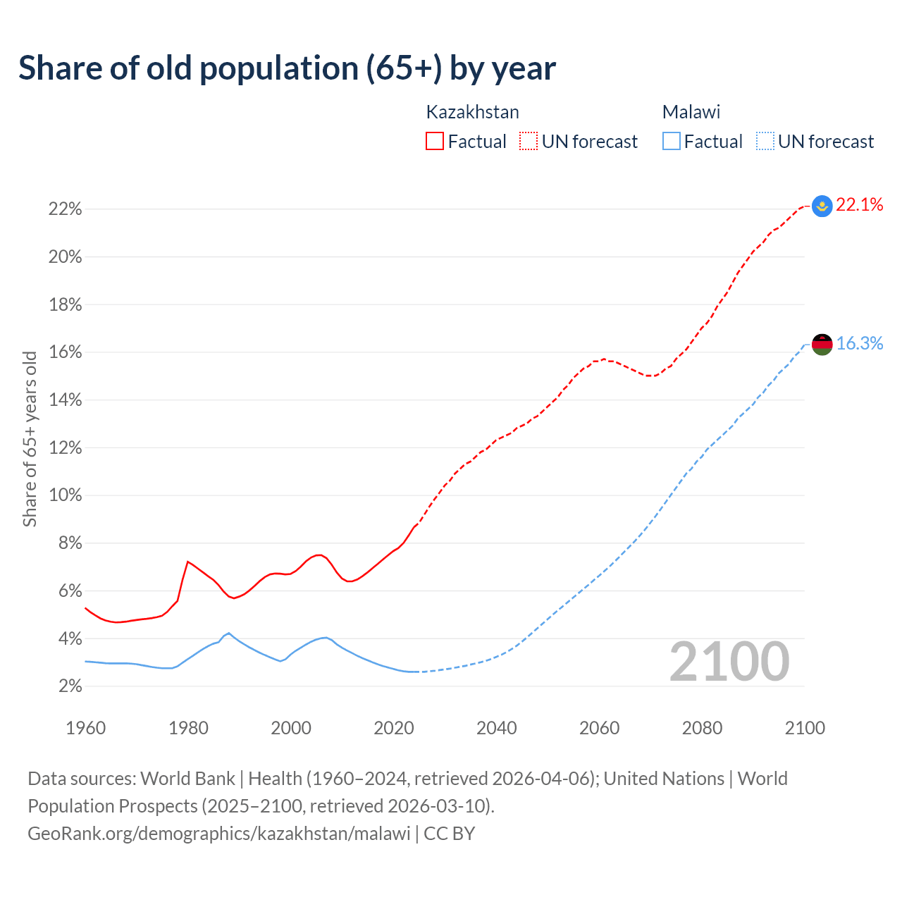 - The share of old-age demographic (65+) in Kazakhstan is 8.65% vs 2.59% in Malawi.