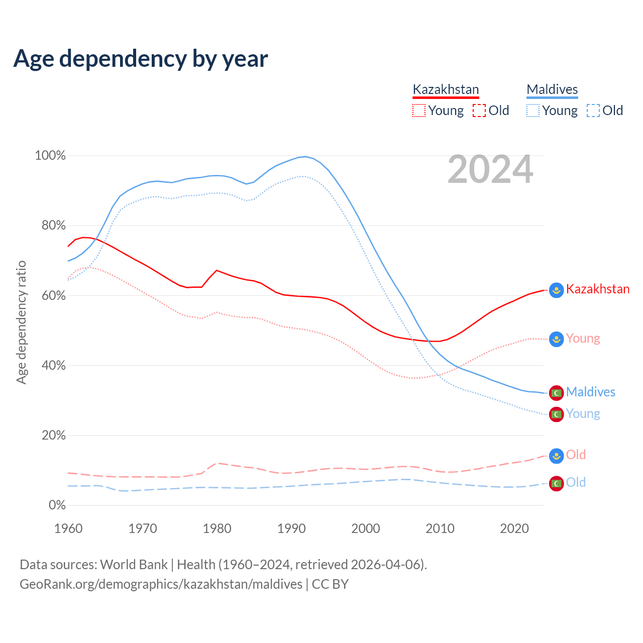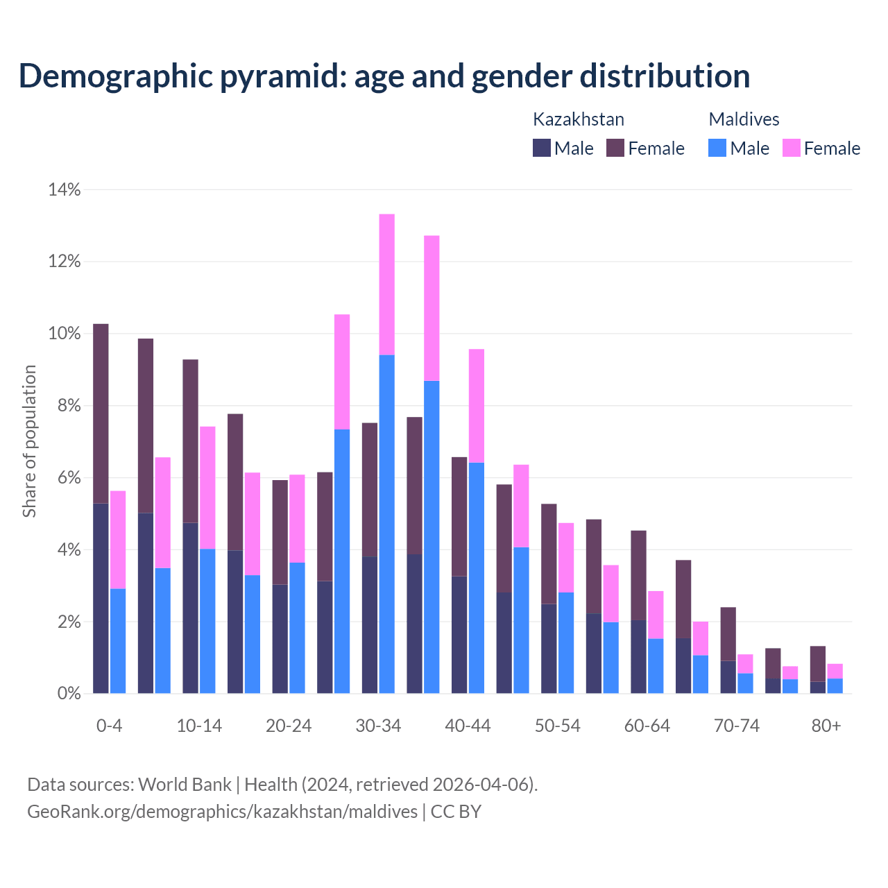 - Kazakhstan is ranked 99/196 by median age (oldest to youngest) vs 90/196 for Maldives.