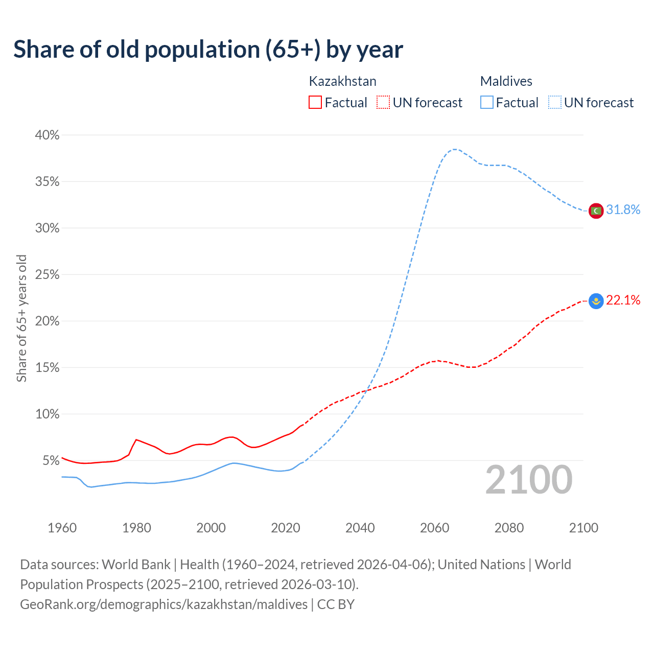 The share of older people aged 65 and over is 8.65% in Kazakhstan and 4.64% in Maldives. Life expectancy in Kazakhstan compared to Maldives .