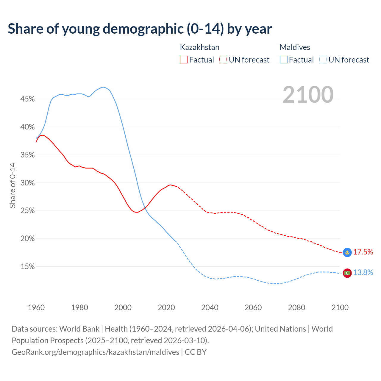 - The share of young demographic (0-15 years old) in Kazakhstan is 29.4% vs 19.6% in Maldives.