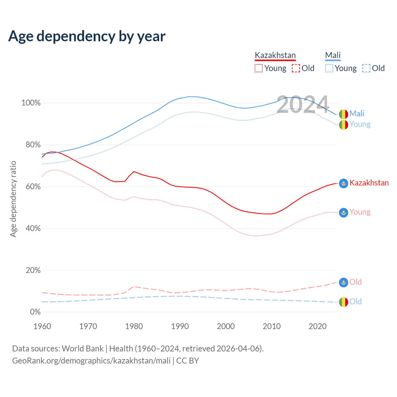 - Kazakhstan is ranked 99/196 by median age (oldest to youngest) vs 193/196 for Mali.