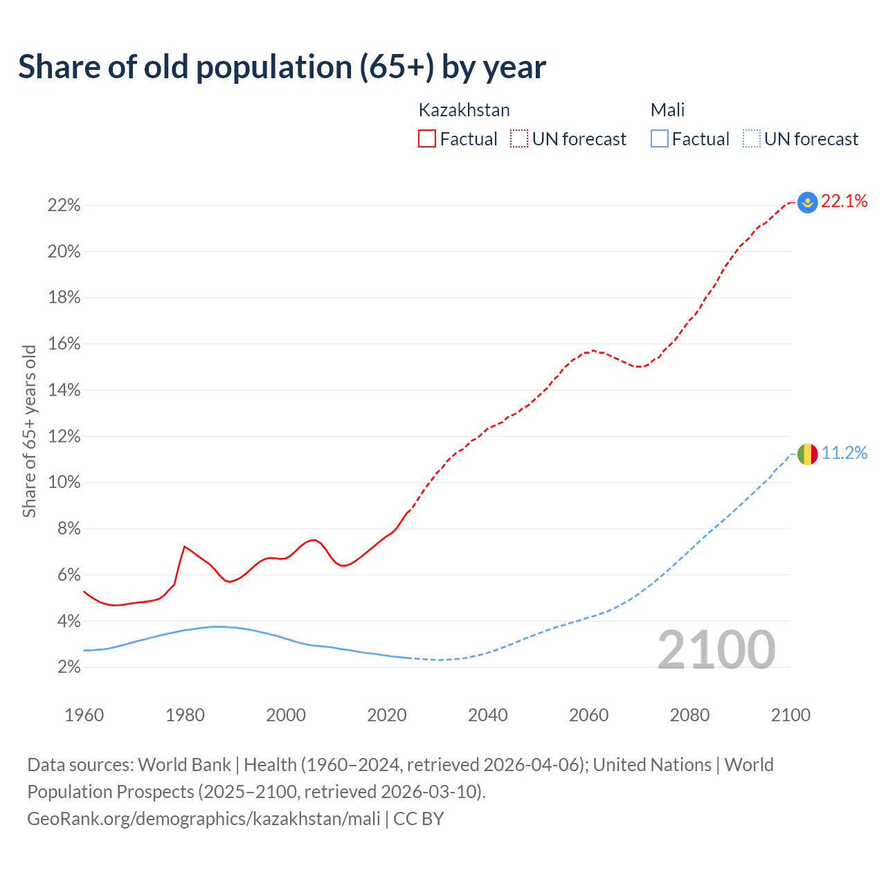 The share of older people aged 65 and over is 8.65% in Kazakhstan and 2.38% in Mali. Life expectancy in Kazakhstan compared to Mali .