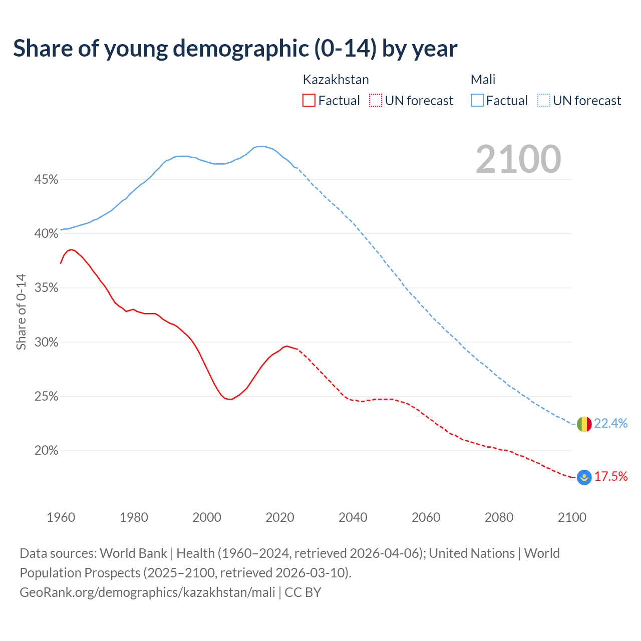 - The share of young demographic (0-15 years old) in Kazakhstan is 29.4% vs 46.1% in Mali.